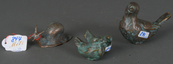 - Katalog-Nr: 844Drei Tierfiguren. Wohl Wien, Franz Bergmann 20. Jh. Bronze, teilw. bunt bemalt. Bestehend aus: Schnecke (H=3,5 cm), Spatzenpaar (H=3,7 cm) und weiterer Vogel (H=6,2 cm).o.L.