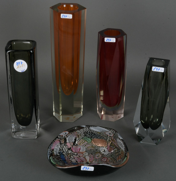- Katalog-Nr: 847Fünftlgs. Konvolut u.a. Murano / Orrefors 20. Jh. Farbloses Glas mit farbigem Überfang bzw. Einschmelzungen. Bestehend aus: Vier Vasen (H=21 bis 30,5 cm) und eine Schale (H=6,5 cm, B=17 cm, T=18,5 cm).o.L.
