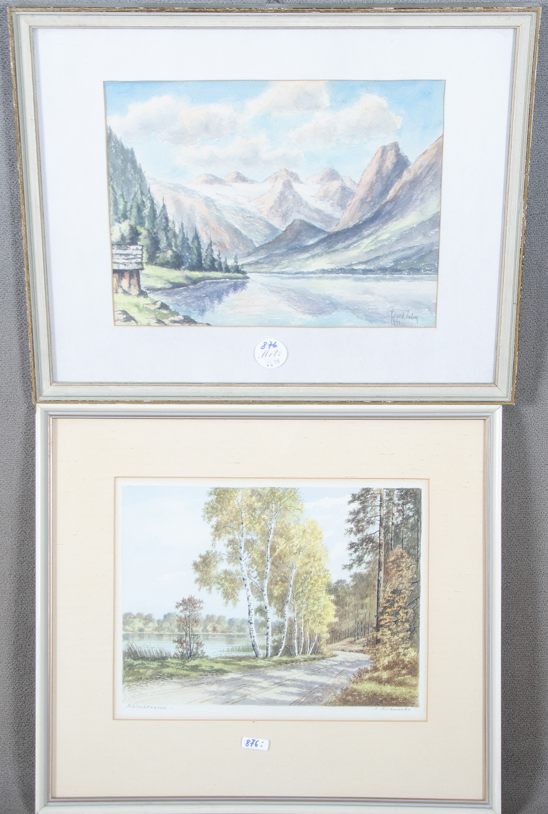 - Katalog-Nr: 876O. Kuhnerts / Roland Zahn (Maler des 20. Jhs.). „Schlachtensee“ und Gebirgsseelandschaft. Zwei Aquarelle/Papier, re./u./sign./bez. bzw. re./u./sign./dat. 1943, je mit Passepartout hi./Gl. gerahmt, 21 x 28 / 23 x 30 cm.o.L.