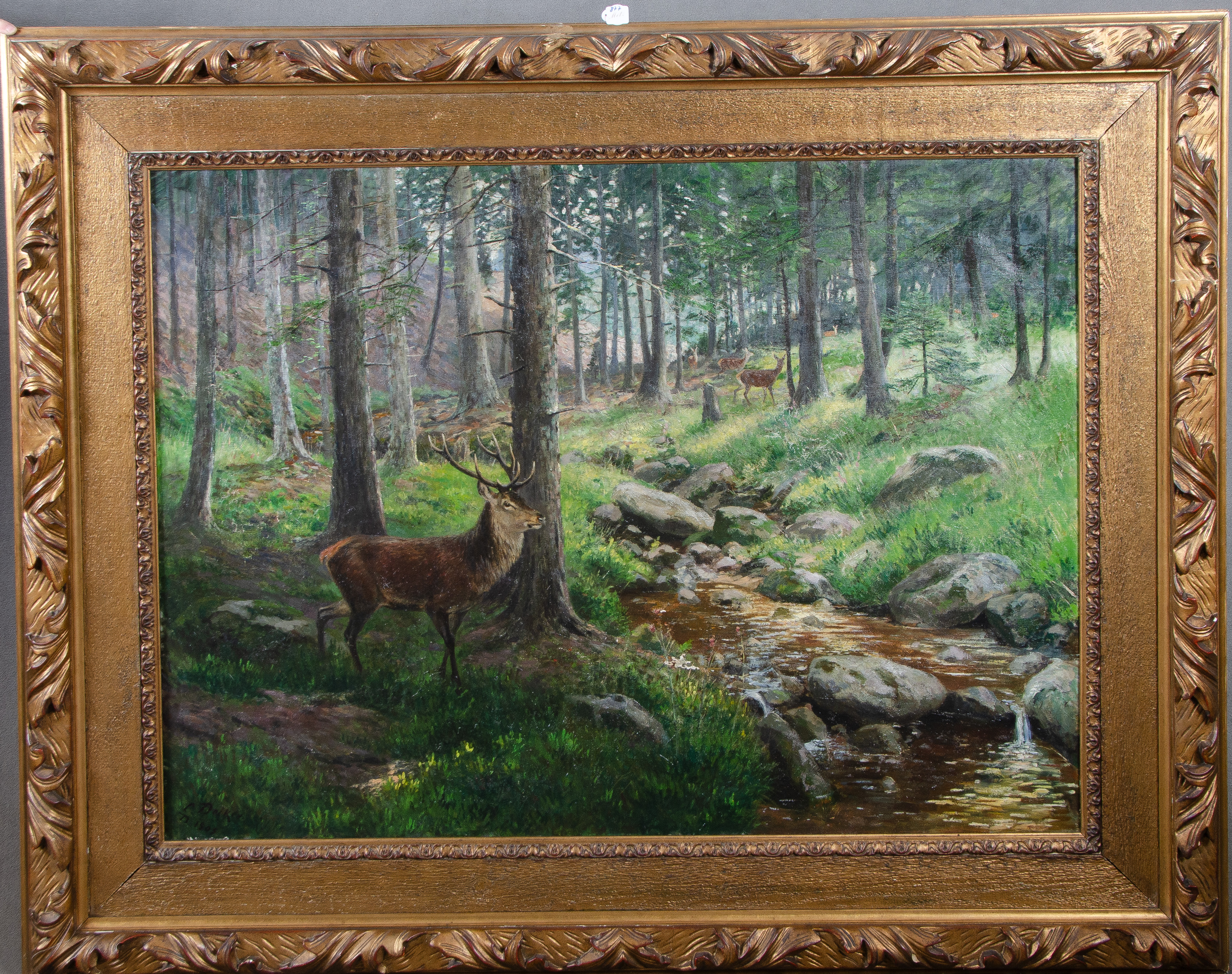 - Katalog-Nr: 877Carl Deiker (1879-1958). Waldlandschaft mit Rotwild. Öl/Lw., li./u./sign./dat. 1903, gerahmt, 101 x 135,5 cm.o.L.