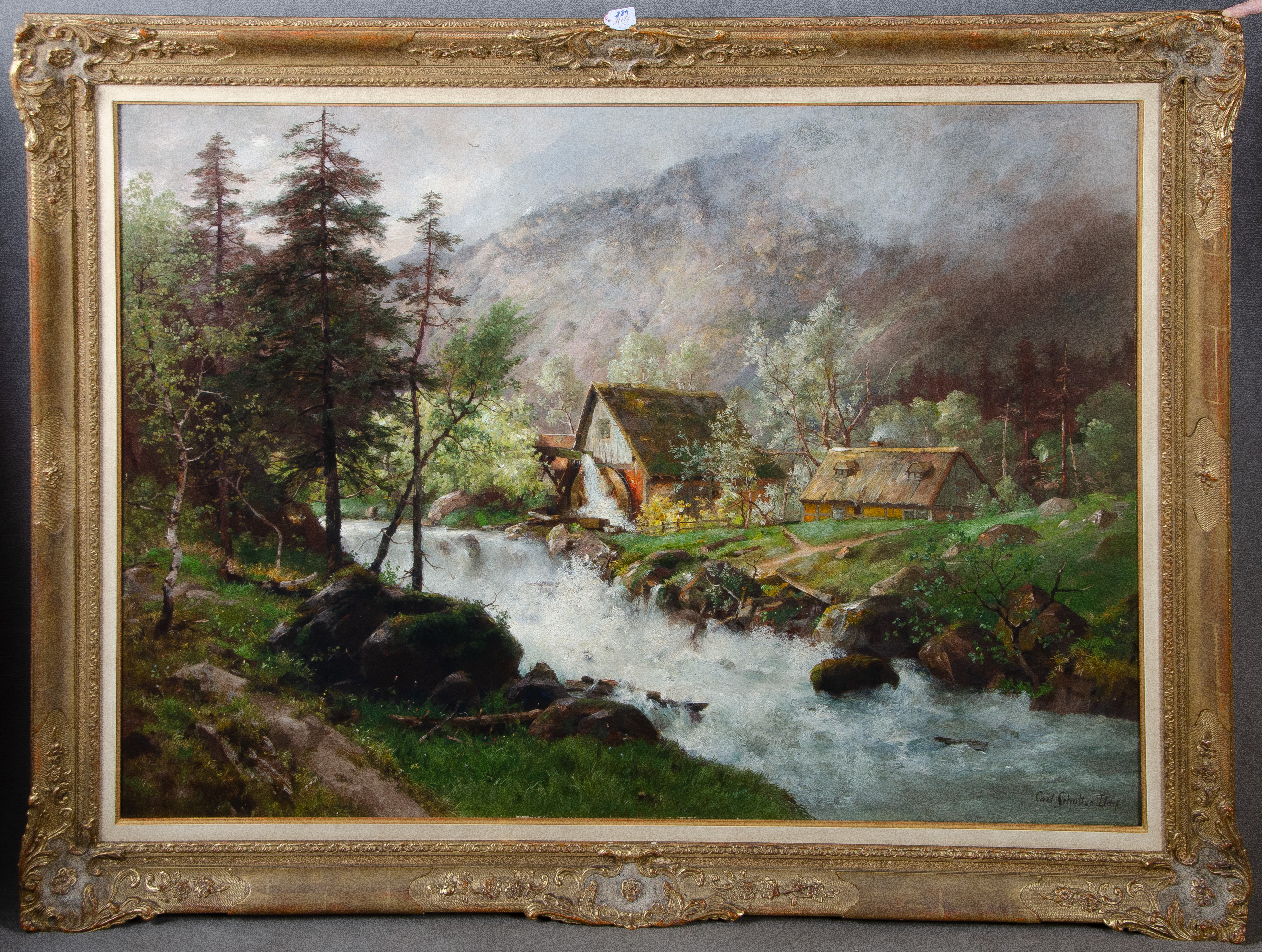 - Katalog-Nr: 889Karl Schultze (1856-1935). Gebirgslandschaft mit Wildbach und Mühle. Öl/Lw., re./u./sign./bez. „D(üssel)d(o)rf“, gerahmt, 89 x 126 cm.o.L.