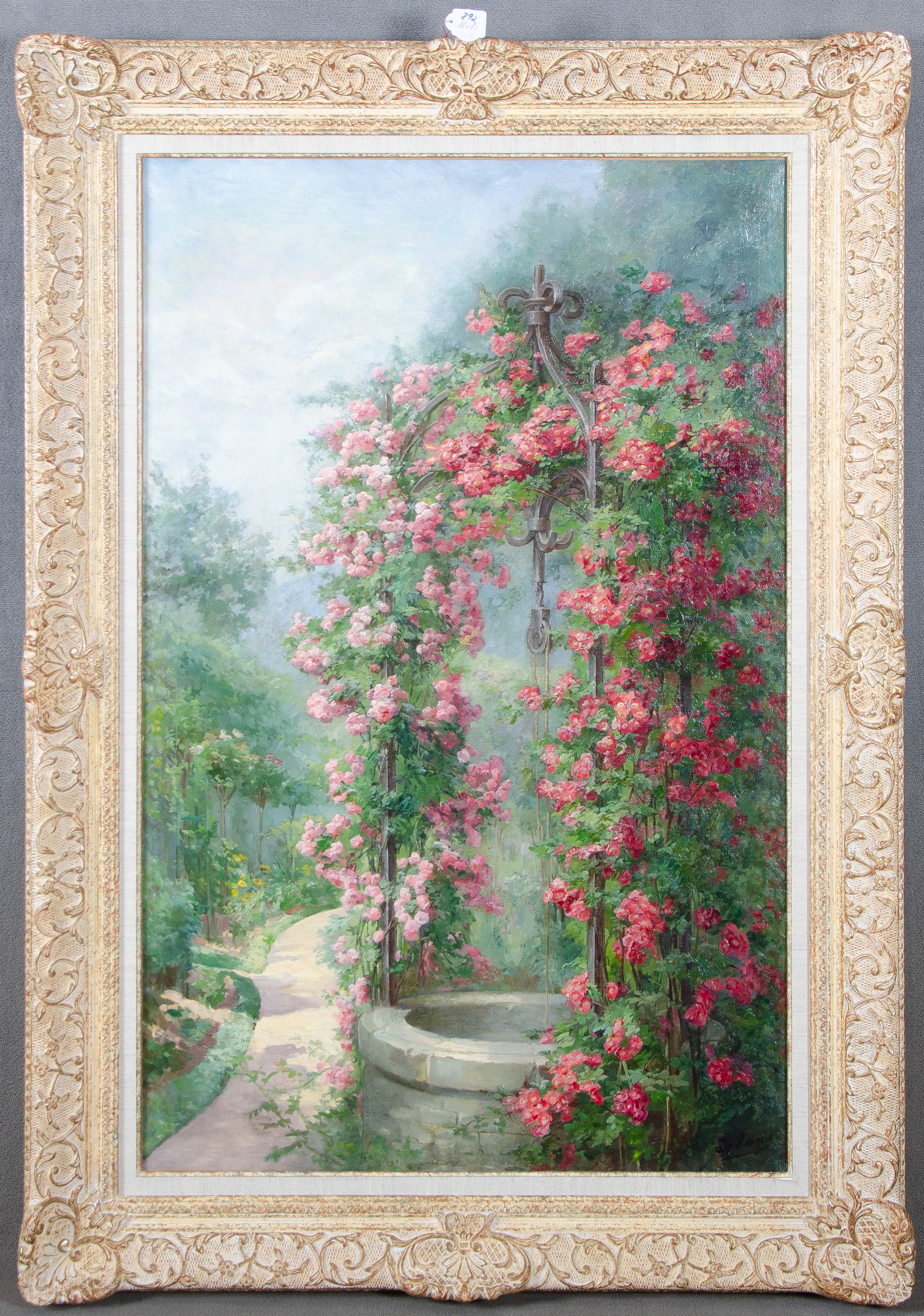 - Katalog-Nr: 892Leonie Louppe (1869-1942). Rosenbogen mit prächtigen Kletterrosen über Brunnen. Öl/Lw., re./u./sign., gerahmt, 98 x 63,5 cm.o.L.