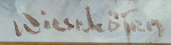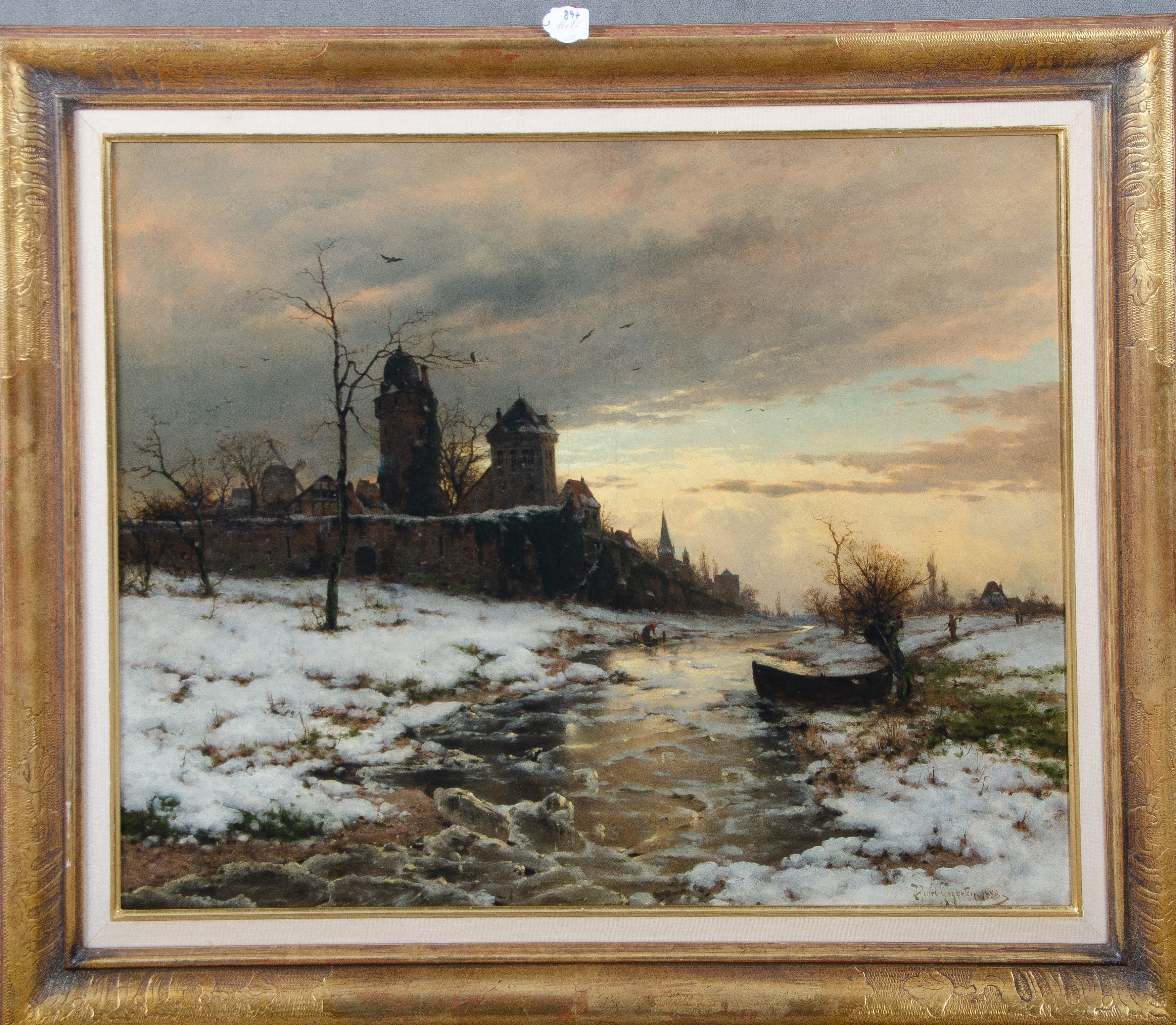 - Katalog-Nr: 897Heinrich Gogarten (1850-1911). Winterlandschaft mit Bachlauf, Boot und Stadtkulisse in der Dämmerung. Öl/Lw., re./u./sign./dat. 1888, gerahmt, 66,5 x 82 cm.o.L.