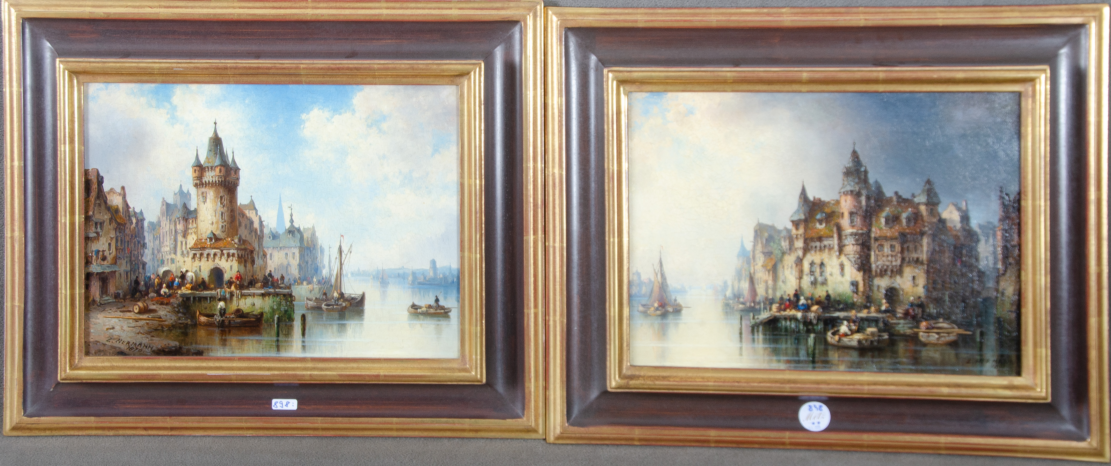 - Katalog-Nr: 898Ludwig Hermann (1812-1881). Paar holländische Stadtansichten mit reicher Personenstaffage. Öl/Lw., li./u./sign./dat. 1870 bzw. re./u./sign./dat. 1871, gerahmt, je 30 x 40 cm.o.L.