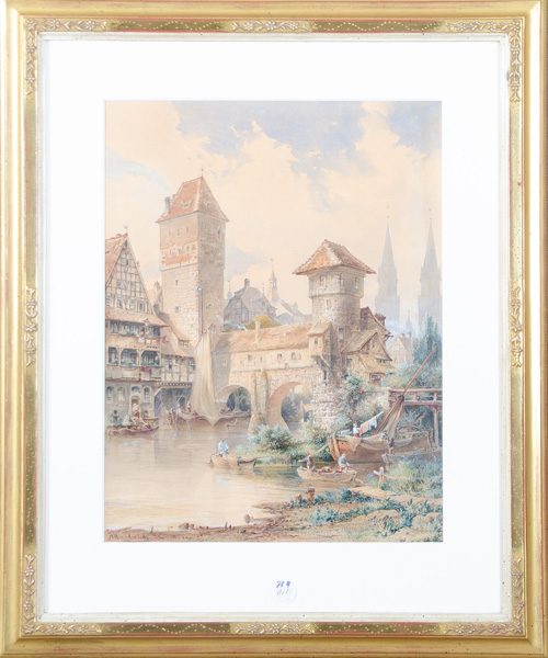 - Katalog-Nr: 884Hermann Moritz Wunderlich (1839-1915). „Nürnberg an der Henkersbrücke“. Aquarell/Papier, li./u./sign./dat. (18)92, verso bez., mit Passepartout hi./Gl. gerahmt, 43 x 41 cm.o.L.