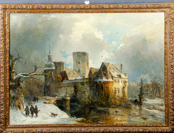 - Katalog-Nr: 890Carl Hilgers (1819-1890). Wasserschloss mit Jägern in Winterlandschaft. Öl/Lw., li./u./sign./dat. (18)74, gerahmt, 96 x 133 cm.o.L.