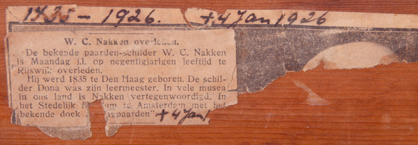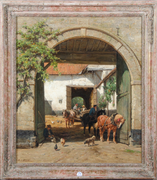 - Katalog-Nr: 896Wilhelm Karel Nakken (1835-1926). Vierkanthof mit Pferden, Federvieh und Hund. Öl/Lw., li./u./sign./dat. (18)93, gerahmt, 84 x 72 cm.o.L.