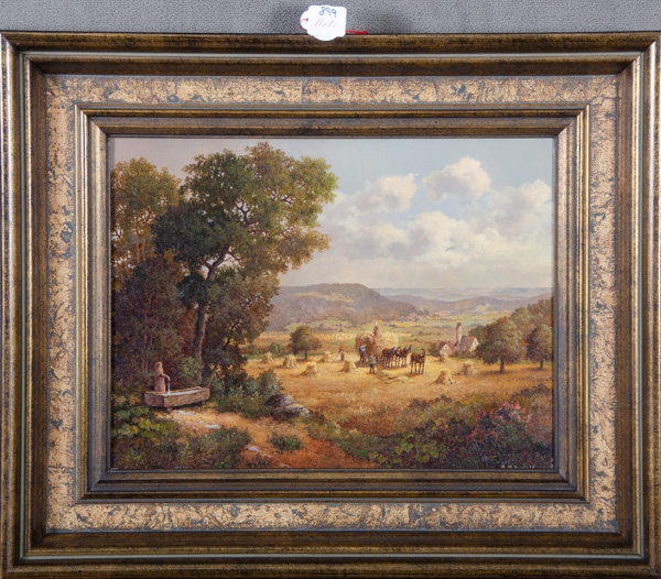 - Katalog-Nr: 899Rainer Maximilian Rudolf (*1931). Ernteszene mit Pferdefuhrwerk und Personenstaffage in Panoramalandschaft. Öl/Spanplatte, re./u./sign., 30 x 40 cm.o.L.