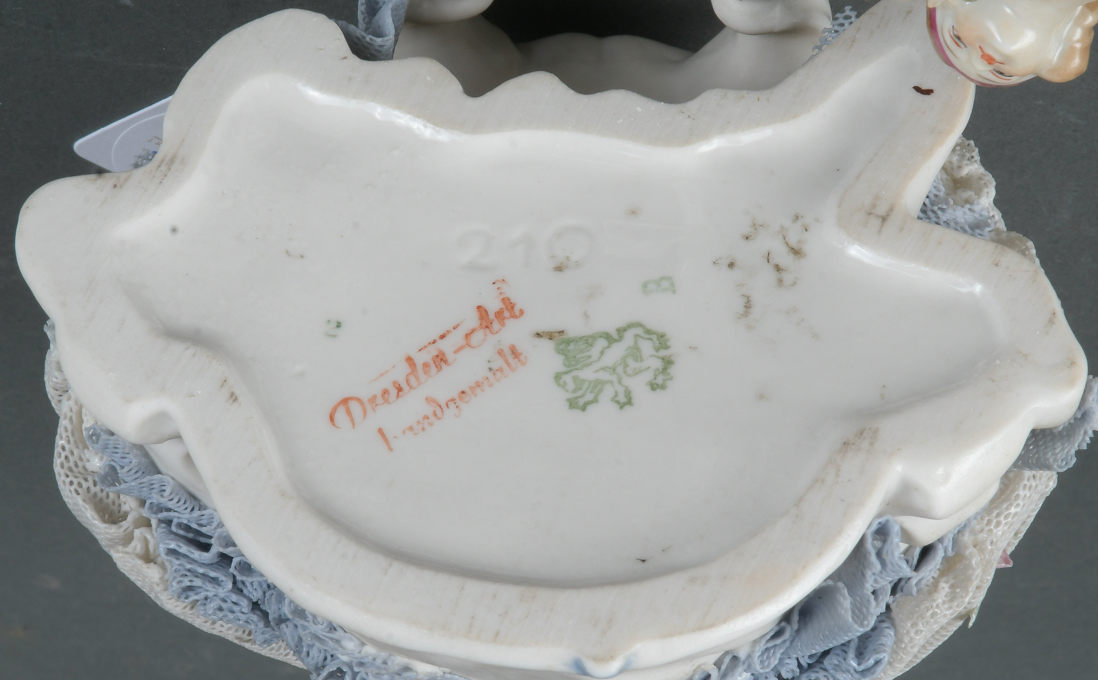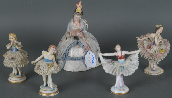 - Katalog-Nr: 1026Fünf Krinolinenfiguren, u.a. Dresden 20. Jh. Porzellan, bunt bemalt, H=10 bis 17 cm. (besch.)o.L.