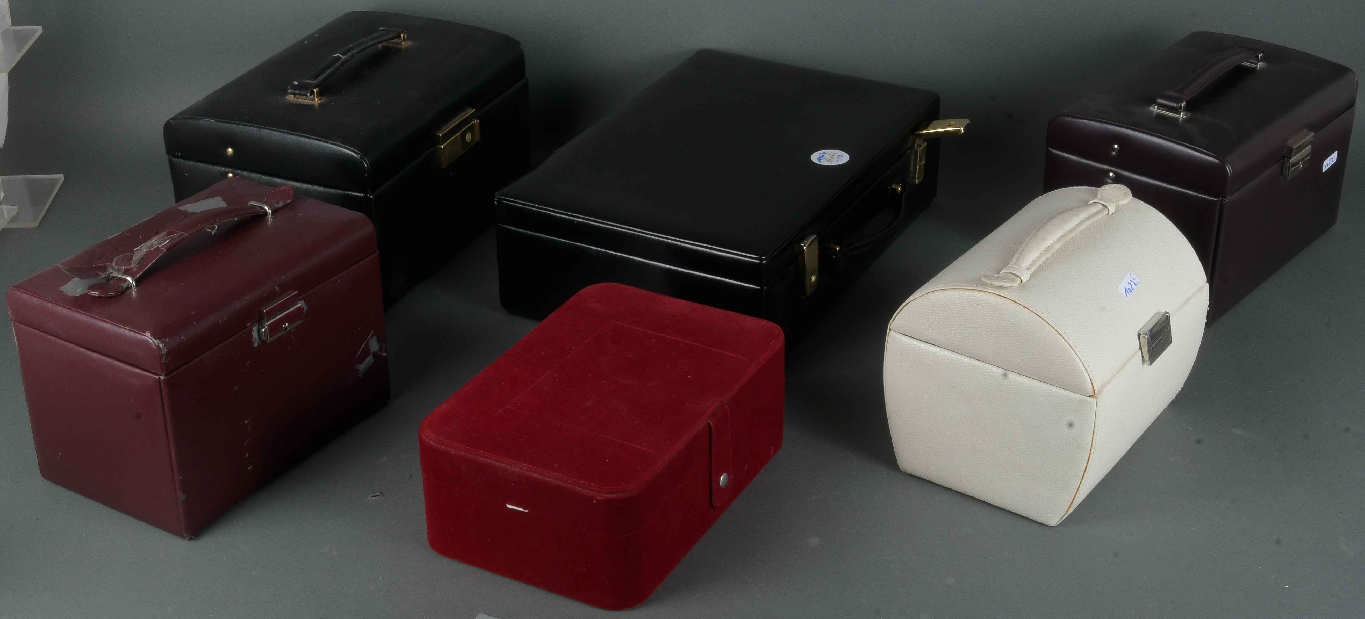 - Katalog-Nr: 1027Sechs unterschiedliche Schmuckschatullen, teilw. Samt / Leder, H=8,5 cm, B=23,5 cm, T=16 cm bis H=10,5 cm, B=35 cm, T=23 cm.o.L.