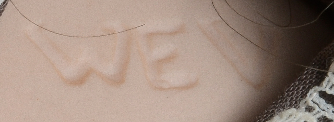 - Katalog-Nr: 1029Zwei Porzellankopfpuppen, eine verso bez. „WEV“, H=38 / 47 cm.o.L.
