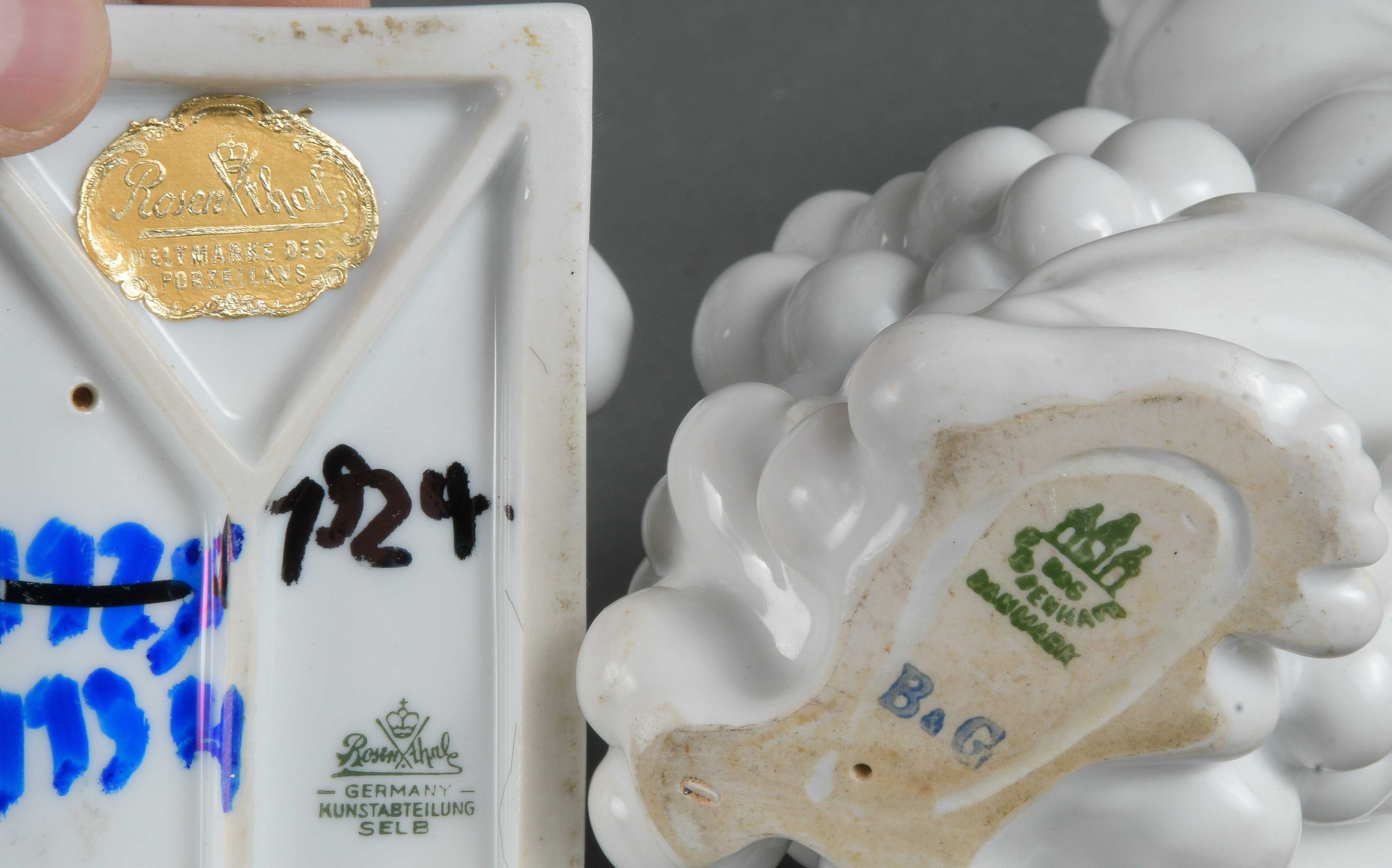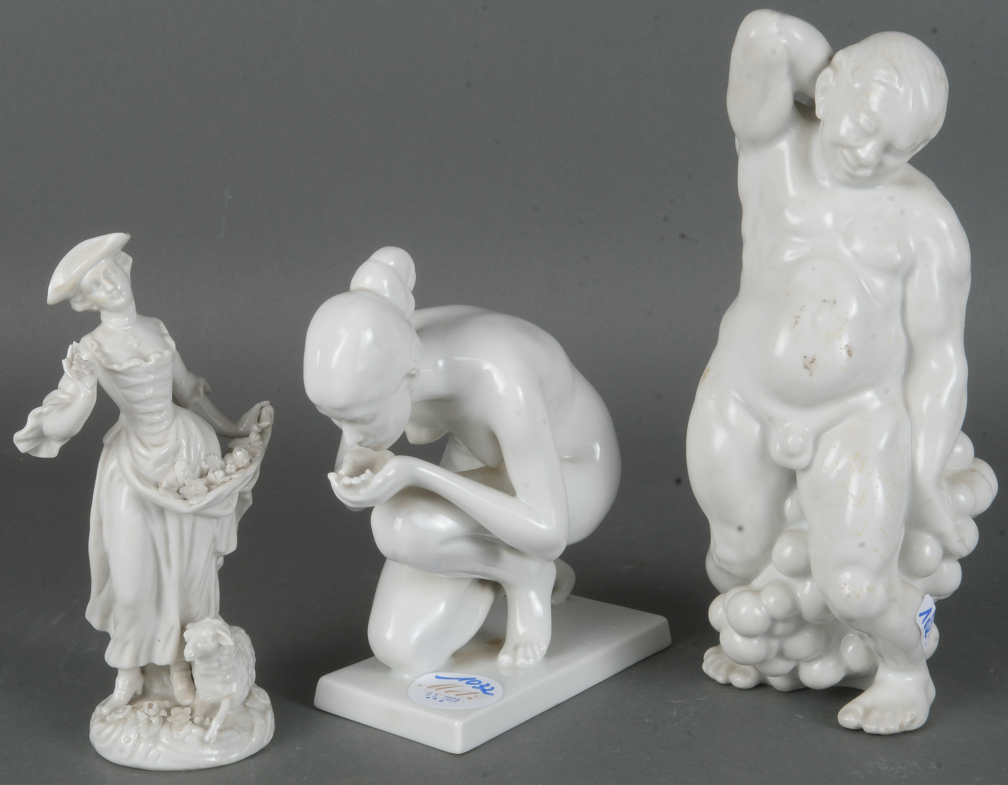 - Katalog-Nr: 1032Drei Figuren, u.a. Bing & Grøndahl / Rosenthal 20. Jh. Porzellan, weiß glasiert, am Boden gemarkt. Bestehend aus: Bacchus (H=22 cm), „Die Trinkende“ von Ernst Wenck (H=15,2 cm) und Schäferin (besch.)o.L.