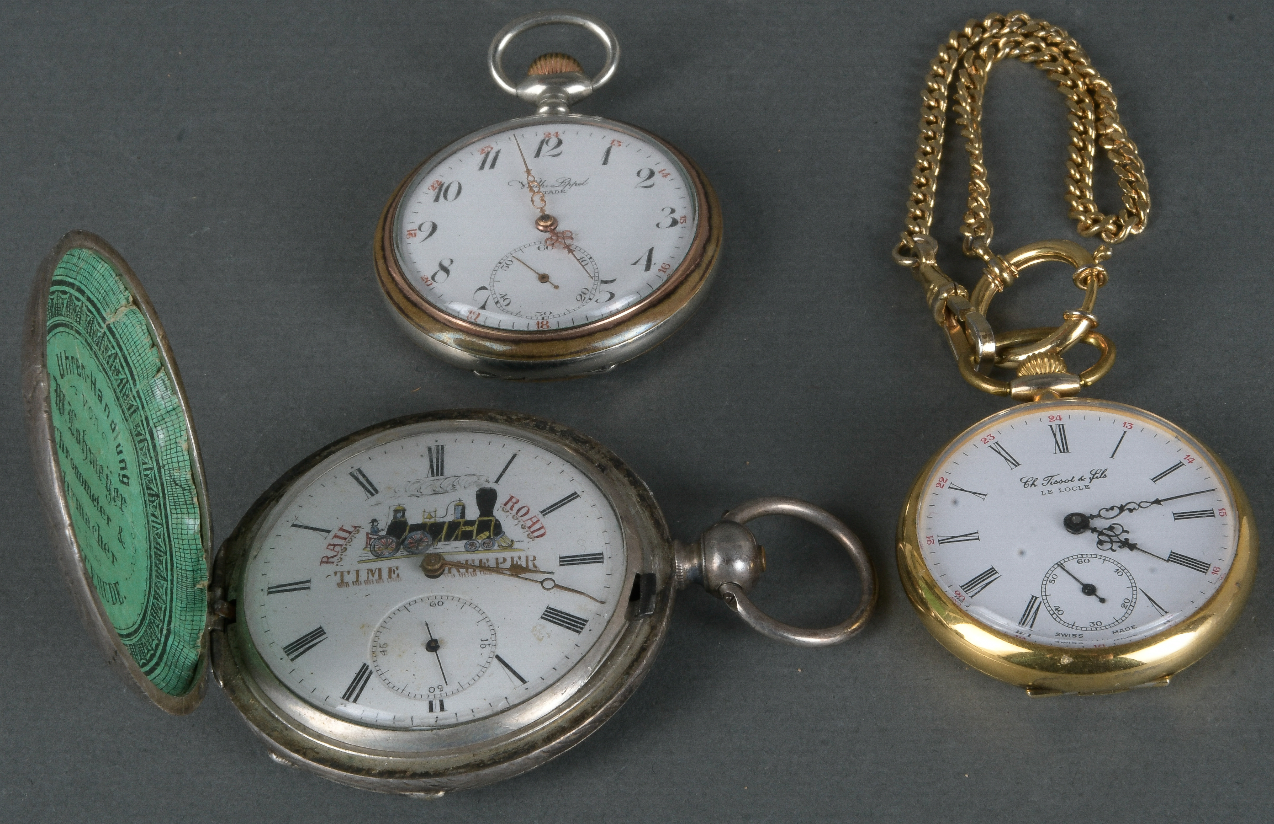 - Katalog-Nr: 1035Taschenuhr „Timekeeper Railroad“. Liverpool 19. Jh. Versilbert, beidseitig ziseliert mit Architekturen, mit doppeltem Schlüsselaufzug; dazu zwei weitere Taschenuhren. (Funktion ungeprüft / ein Glas lose)o.L.