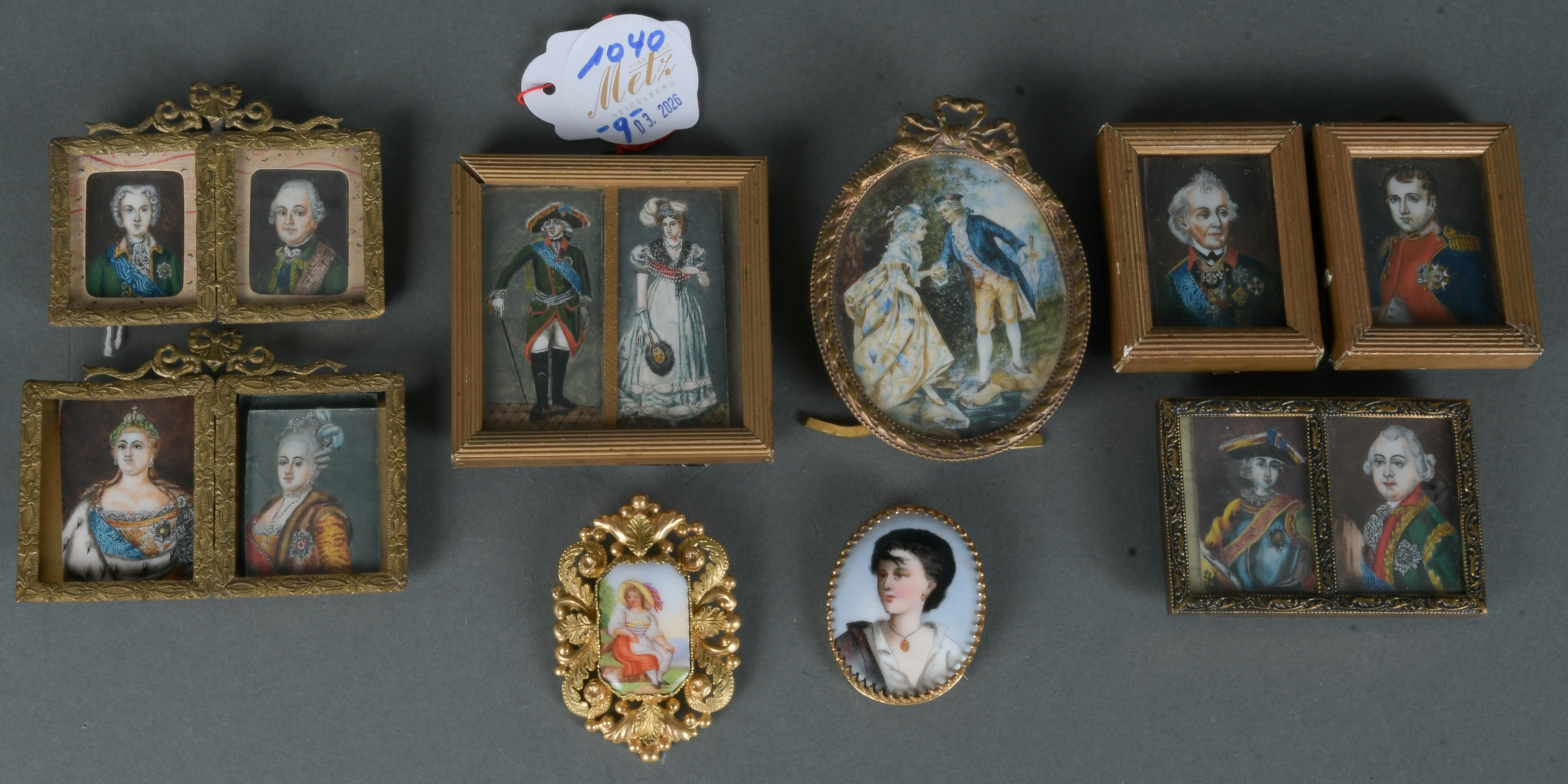 - Katalog-Nr: 1040Neun Rahmen. Deutsch 19./20. Jh. Teilw. bemalt mit den Porträts berühmter Persönlichkeiten wie der Alte Fritz und Napoleon, 2,5 x 2 bis 8 x 6 cm.o.L.