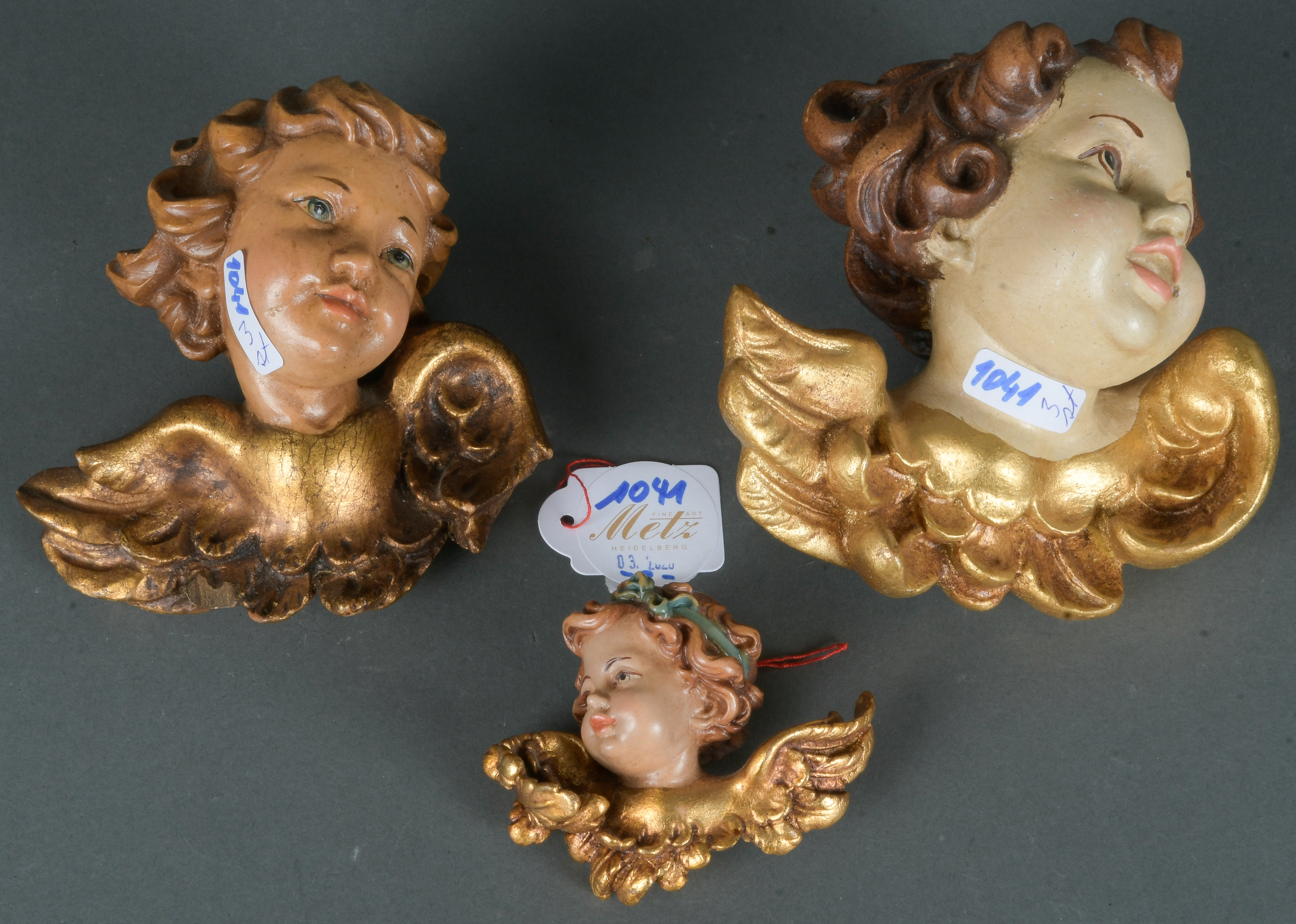 - Katalog-Nr: 1041Drei Puttenköpfe. Deutsch 20. Jh. Kunstmasse, gold und farbig gefasst, H=6,5 bis 13 cm.o.L.