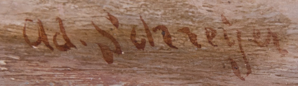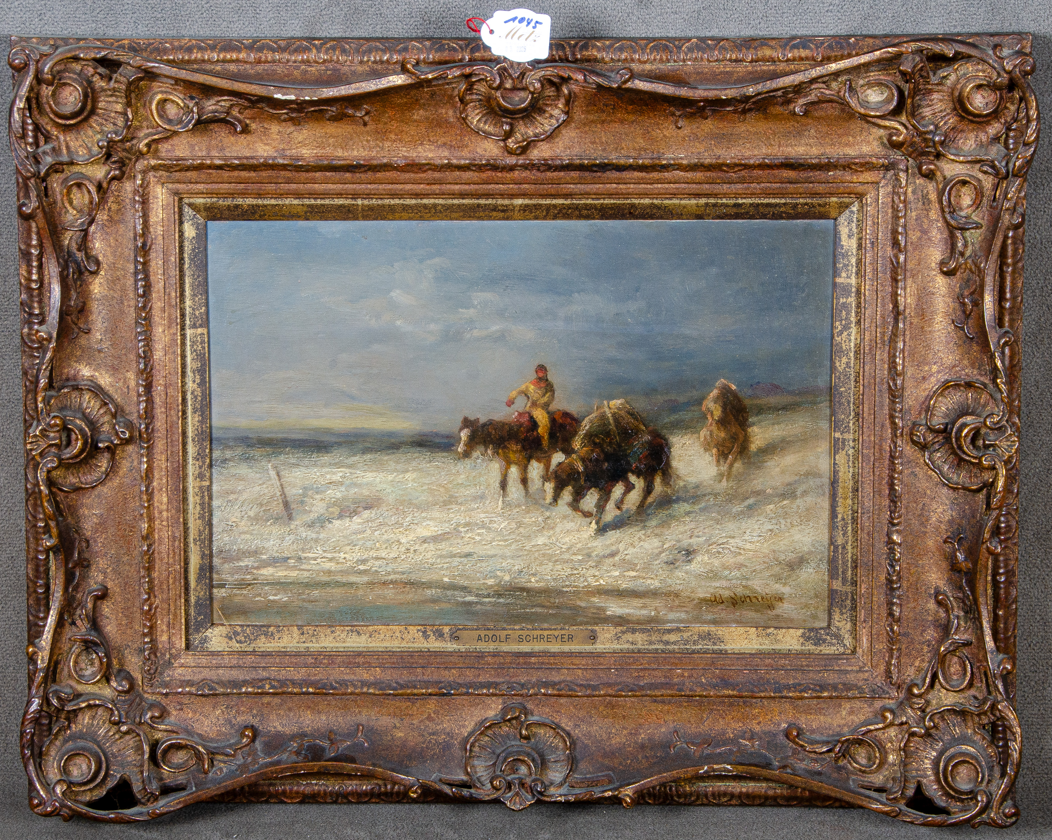 - Katalog-Nr: 1045Adolf Schreyer (1828-1899). Winterlandschaft mit Reitern. Öl/Holz, li./u./sign., gerahmt, 28,5 x 40 cm.o.L.