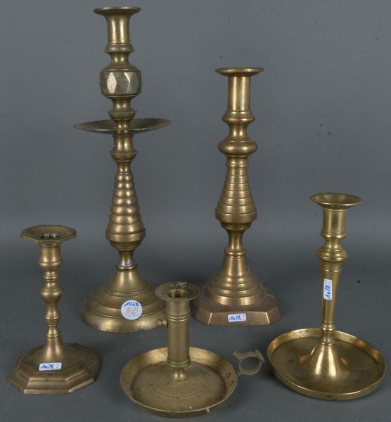 - Katalog-Nr: 1028Fünf unterschiedliche Kerzenleuchter. Deutsch / Holland / Marokko 18./19. Jh. Bronze / Messing, H=12,5 bis 43,5 cm.o.L.