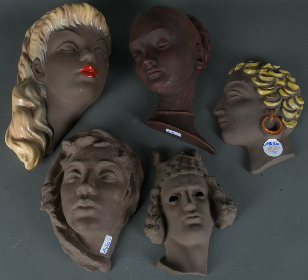 - Katalog-Nr: 1030Vier Wandreliefs „Mädchenkopf“ und Bamberger Reiter, u.a. Karlsruher Majolika 20. Jh. Irdenware, teilw. bunt glasiert, H=19 bis 31 cm.o.L.