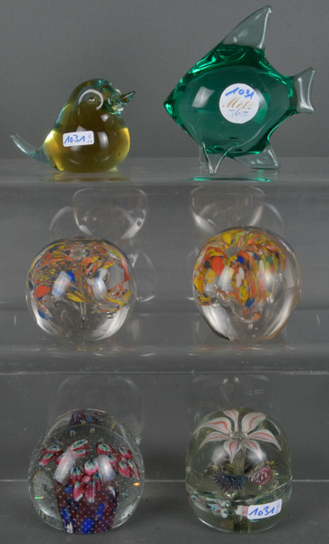 - Katalog-Nr: 1031Sechstlgs. Konvolut Glas. Deutsch / Italien 20. Jh. Mit bunten Einschmelzungen. Bestehend aus: Vier Paperweights (H=7,5 bis 8 cm), ein Vogel (H=7 cm) und ein Fisch (H=12,5 cm).o.L.