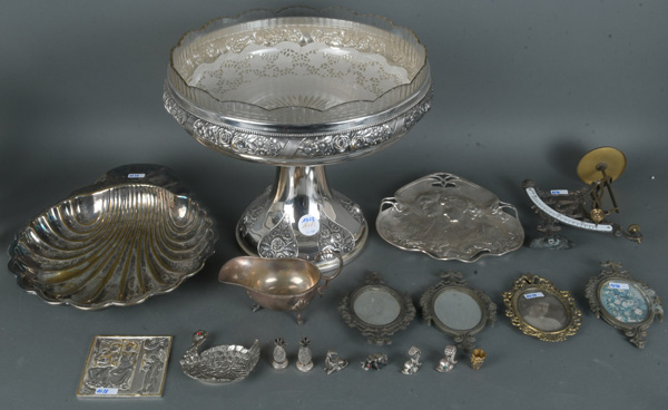 - Katalog-Nr: 1038Konvolut Versilbertes und Metall, u.a. div. Rahmen und Tafelaufsatz, H=4 bis 30 cm.o.L.