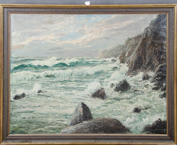 - Katalog-Nr: 1046Josef Rolf Knobloch (1891-1964). Küstenlandschaft. Öl/Lw. auf Hartfaser aufgezogen, re./u./sign./bez. „München“, gerahmt, 96 x 120 cm.o.L.