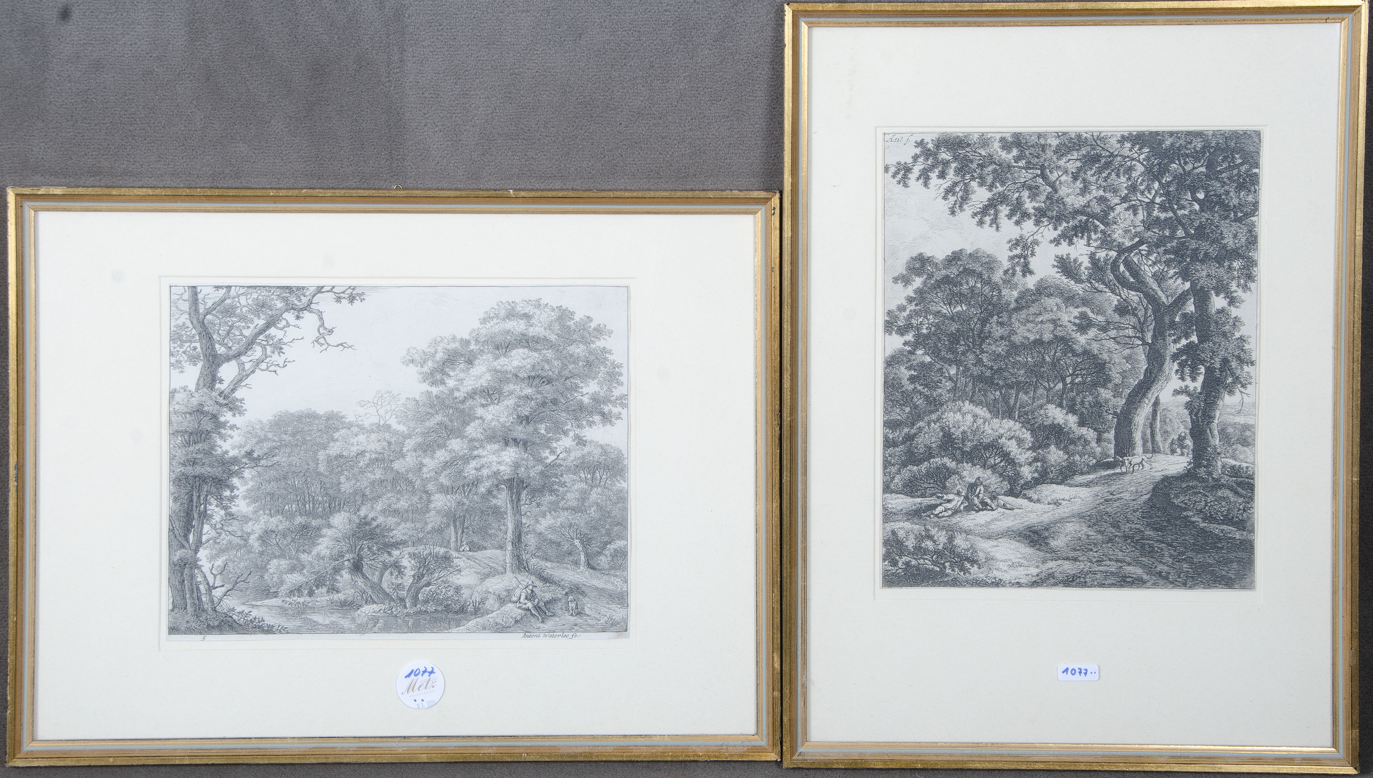 - Katalog-Nr: 1077Antonie Waterloo (1609-1690). Rastende Wanderer mit Hund im Wald. Zwei Radierungen, re./u./sign., li./o./monogr., mit Passepartout hi./Gl. gerahmt, 23 x 28,5 / 28,5 x 22 cm.o.L.