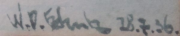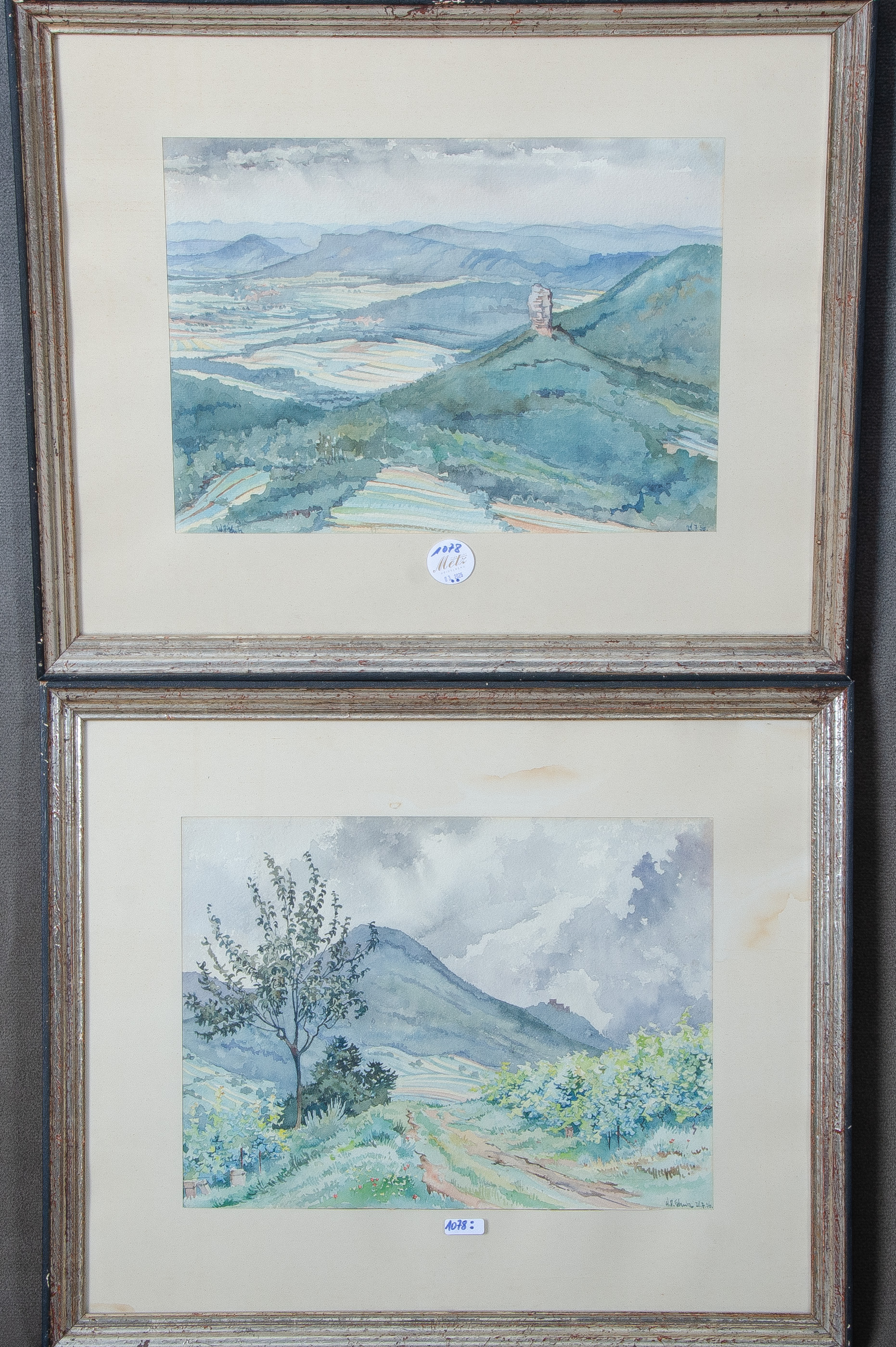 - Katalog-Nr: 1078Maler des 20. Jhs. Zwei Hügellandschaften. Aquarell/Papier, li. und re./u. unleserlich sign., re./u./dat. 21.7.(19)36 bzw. 28.7.(19)36, mit Passepartout hi./Gl. gerahmt, je 25 x 34 cm.o.L.