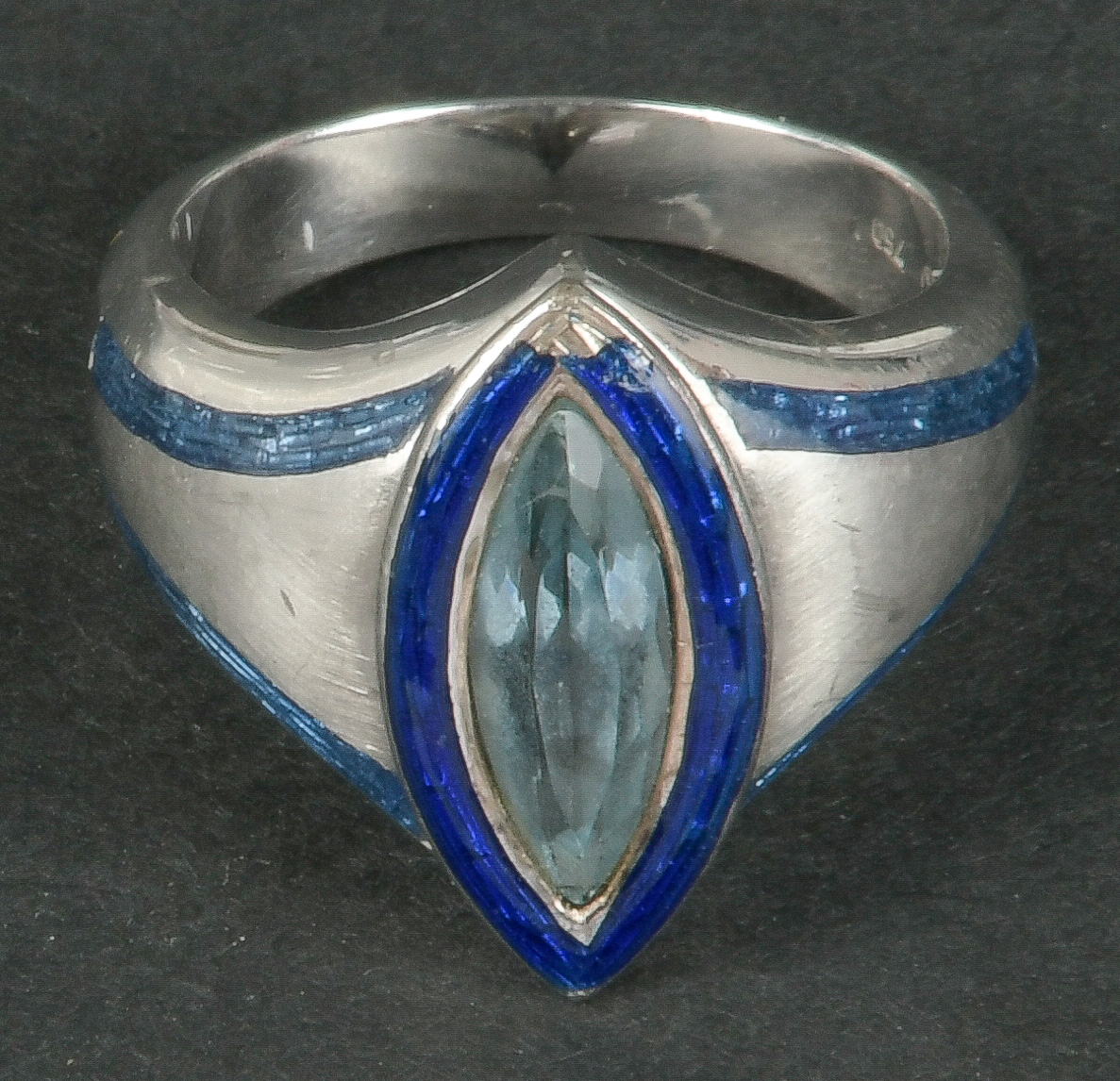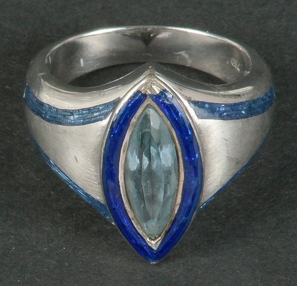 - Katalog-Nr: 1090Damenring. 18 kt Gold, besetzt mit Aquamarin, teilw. emailliert, Gesamtgewicht ca. 12,6 g, Ringgröße 54.o.L.