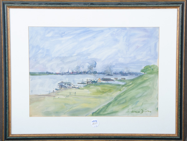 - Katalog-Nr: 1076Otto Dill (1884-1957). Flusslandschaft mit Stadtansicht. Aquarell/Papier, re./u./sign., mit Passepartout hi./Gl. gerahmt, 33 x 49,5 cm.o.L.