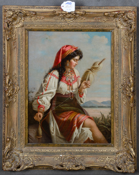 - Katalog-Nr: 1083S. Schmide (Maler des 20. Jhs.) nach Anton Romako. Junge Dame an der Spindel. Öl/Lw., li./u./sign., gerahmt, 32,5 x 24,5 cm.o.L.
