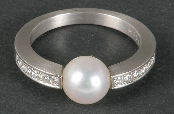 - Katalog-Nr: 1098Damenring. 18 kt Gold, besetzt mit Zuchtperle und Brillanten, ca. 0,20 ct, Gesamtgewicht ca. 8,3 g, Ringgröße 60. Die Begutachtungen der verarbeiteten Edelsteine und Diamanten wurden im gefassten Zustand vorgenommen, d.h. unter Vorbehalt einer sachgerechten Graduierung, die nur an ungefassten Steinen erfolgen kann. Dies hat zur Folge, dass die Gewichte (sog. "berechnete Gewichte", d.h. ca.+/- 10 % Abweichung) und Qualitäten (Farbe, Reinheit und Schliff) der Steine nur annähernd angegeben werden können.o.L.