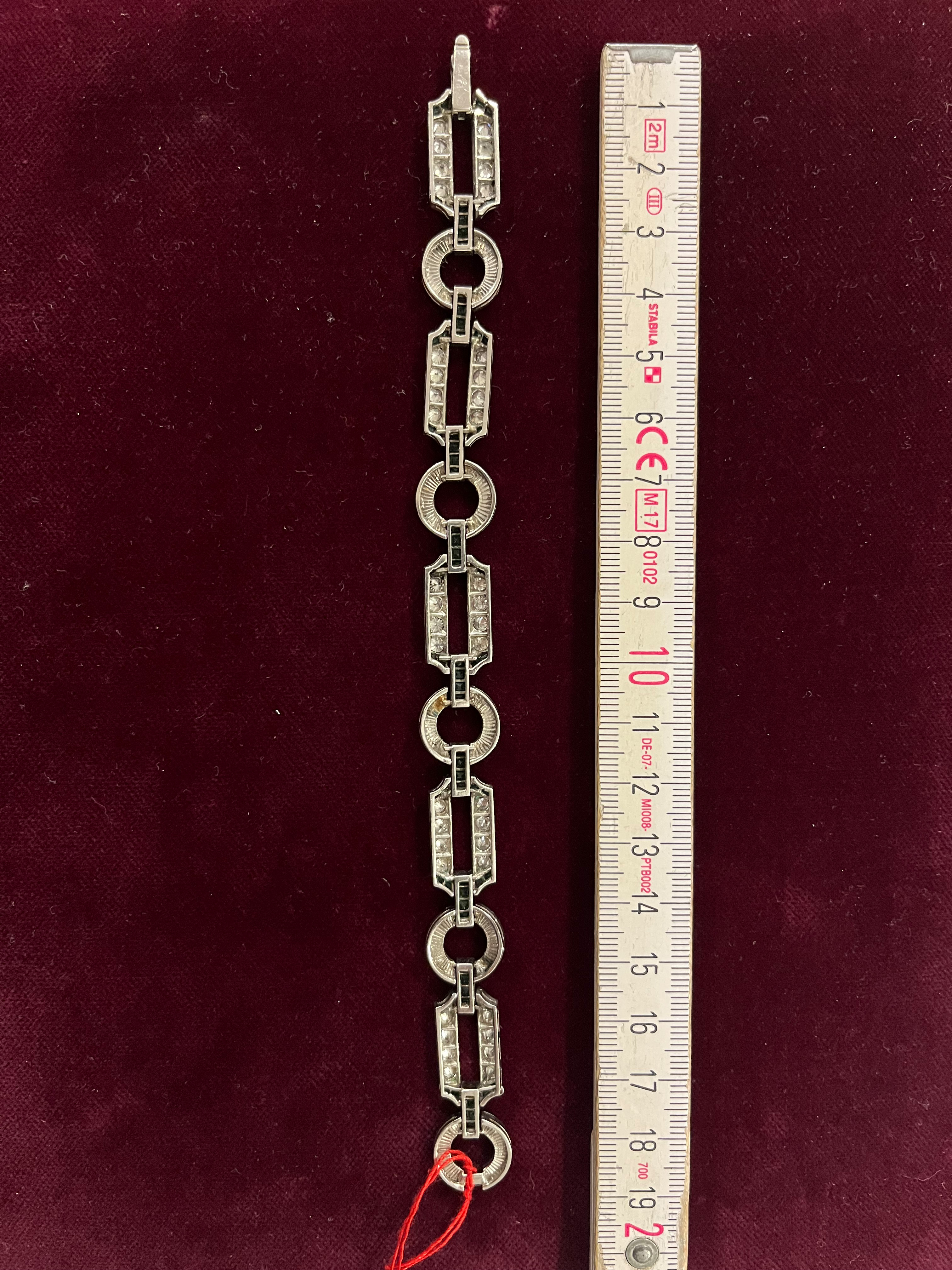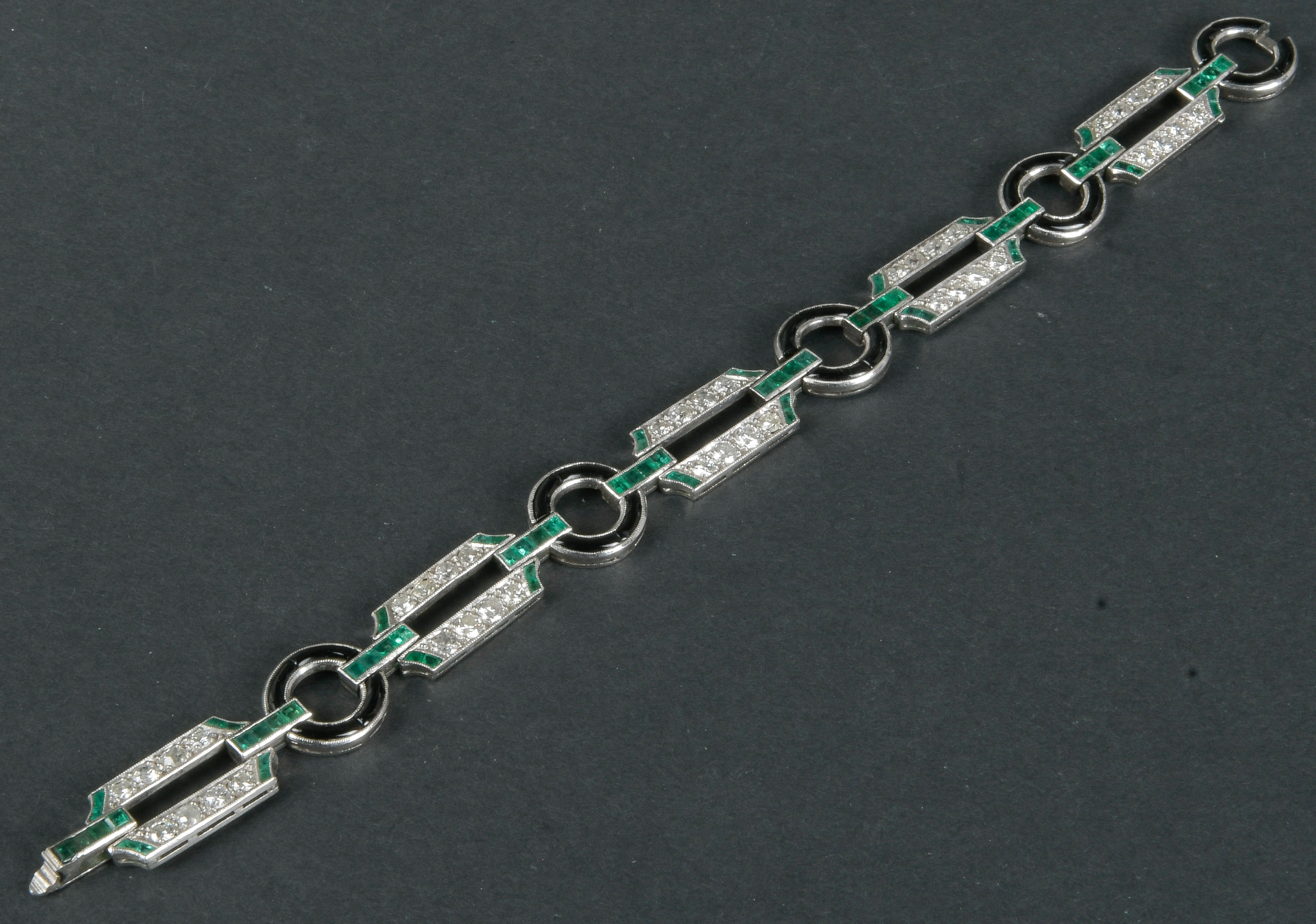 - Katalog-Nr: 1158Gliederarmband. Platin, besetzt mit Brillanten, ca. 4,0 ct, und Smaragden, teilw. emailliert, Gesamtgewicht ca. 24,6 cm, L=19 cm. Die Begutachtungen der verarbeiteten Edelsteine und Diamanten wurden im gefassten Zustand vorgenommen, d.h. unter Vorbehalt einer sachgerechten Graduierung, die nur an ungefassten Steinen erfolgen kann. Dies hat zur Folge, dass die Gewichte (sog. "berechnete Gewichte", d.h. ca.+/- 10 % Abweichung) und Qualitäten (Farbe, Reinheit und Schliff) der Steine nur annähernd angegeben werden können.o.L.