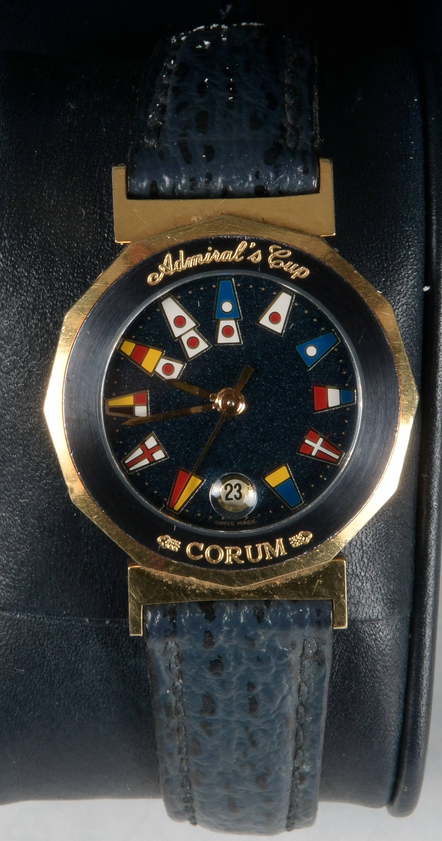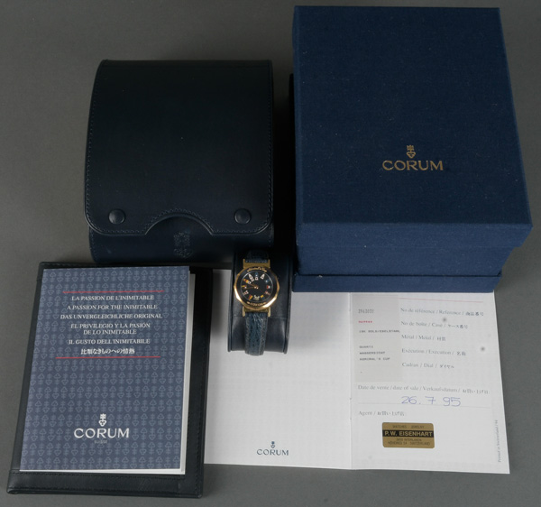 - Katalog-Nr: 1165Damenarmbanduhr „Corum“. 18 kt Gold / Edelstahl, in Box. Mit Papieren von 2023 und 2026 und Wertangabe über EUR 10.000,00. (Funktion ungeprüft)o.L.