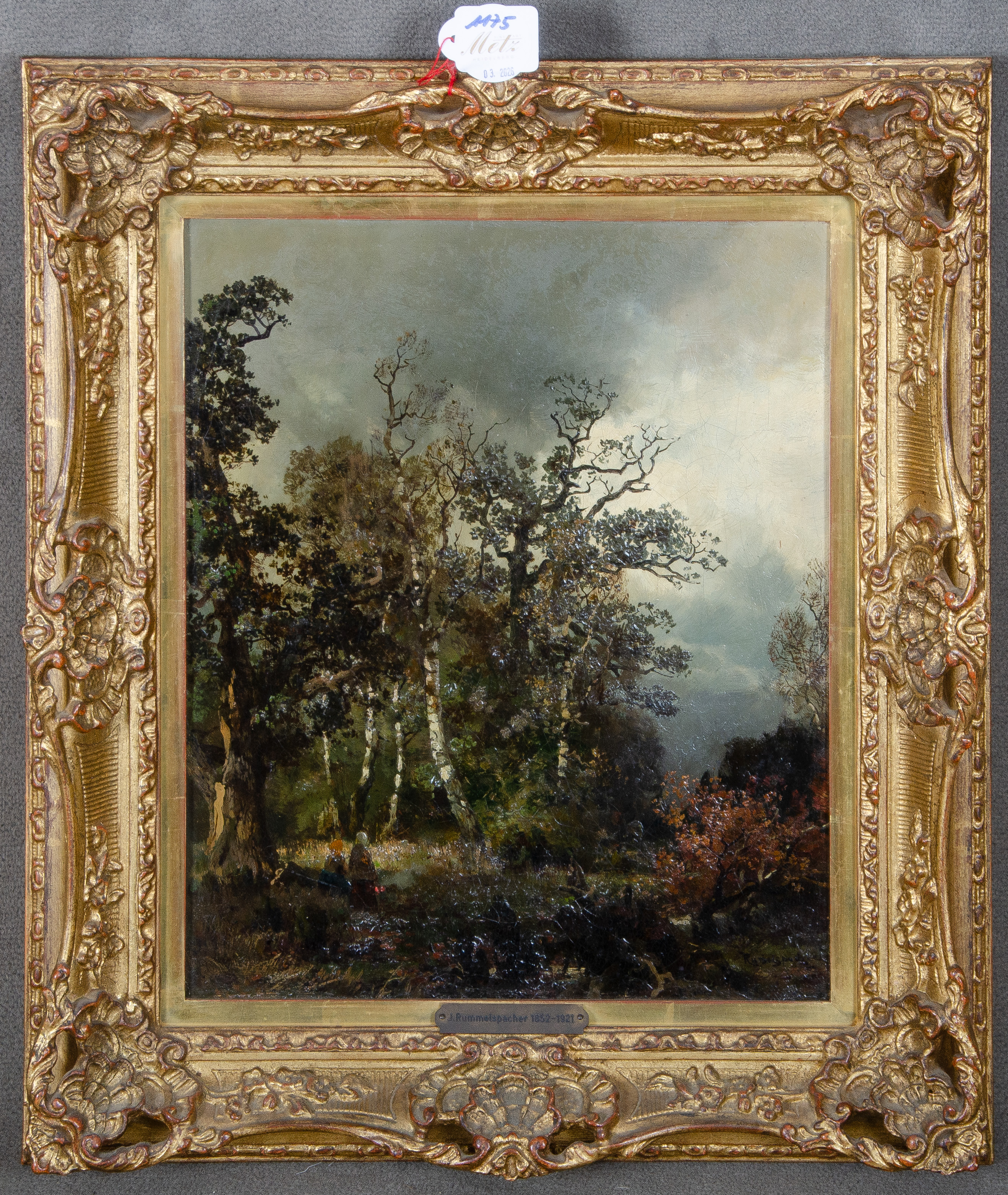 - Katalog-Nr: 1175Joseph Rummelspacher (1852-1921). Waldlandschaft mit zwei weiblichen Figuren. Öl/Lw., doubliert, re./u./sign., gerahmt, 32 x 26 cm.o.L.