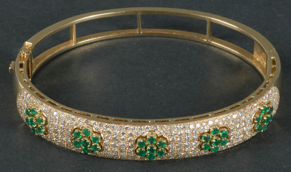 - Katalog-Nr: 1159Armreif. 18 kt Gold, besetzt mit Brillanten, ca. 3,5 ct, und Smaragden, Gesamtgewicht ca. 28,4 g. Die Begutachtungen der verarbeiteten Edelsteine und Diamanten wurden im gefassten Zustand vorgenommen, d.h. unter Vorbehalt einer sachgerechten Graduierung, die nur an ungefassten Steinen erfolgen kann. Dies hat zur Folge, dass die Gewichte (sog. "berechnete Gewichte", d.h. ca.+/- 10 % Abweichung) und Qualitäten (Farbe, Reinheit und Schliff) der Steine nur annähernd angegeben werden können.o.L.