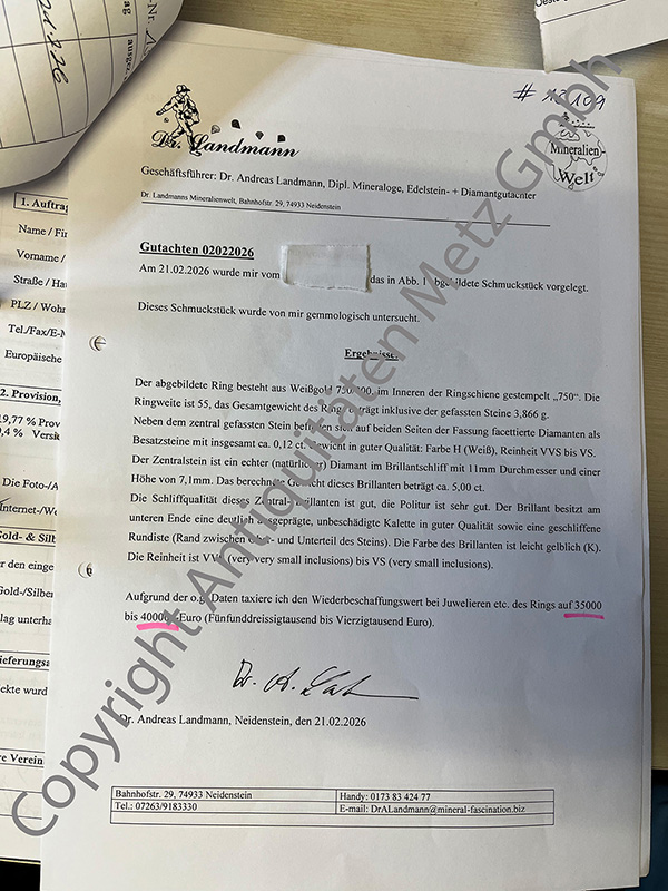 - Katalog-Nr: 1161Solitärring. 18 kt Gold, besetzt mit Brillant, ca. 5,5 ct, Gesamtgewicht ca. 3,8 g, Ringgröße 55. Gemmologisches Gutachten von Dr. Andreas Landmann, Neidenstein 21.02.2026, mit Zeitwertangabe über EUR 35.000,00 bis 40.000,00 liegt vor und kann für EUR 120,00 erworben werden. Die Begutachtungen der verarbeiteten Edelsteine und Diamanten wurden im gefassten Zustand vorgenommen, d.h. unter Vorbehalt einer sachgerechten Graduierung, die nur an ungefassten Steinen erfolgen kann. Dies hat zur Folge, dass die Gewichte (sog. "berechnete Gewichte", d.h. ca.+/- 10 % Abweichung) und Qualitäten (Farbe, Reinheit und Schliff) der Steine nur annähernd angegeben werden können.o.L.
