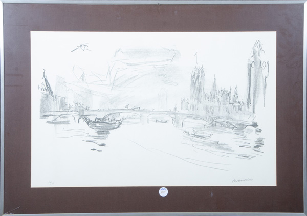 - Katalog-Nr: 1170Oskar Kokoschka (1886-1980). Ansicht von London mit der Themse. Lithographie 12/76, re./u./sign., mit Passepartout hi./Gl. gerahmt, 52 x 81 cm.o.L.