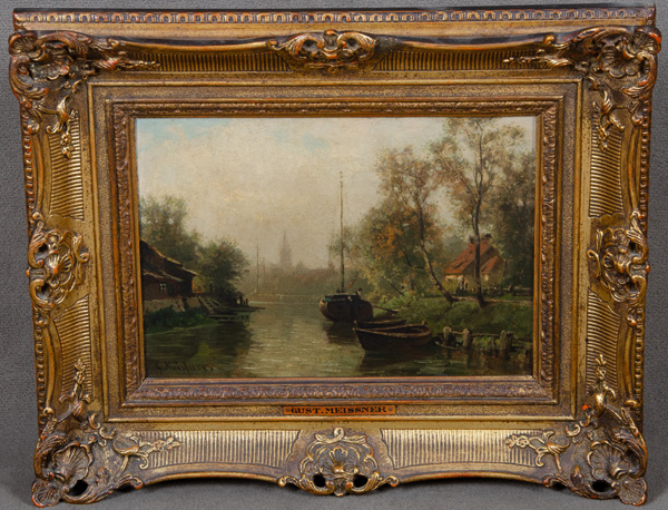 - Katalog-Nr: 1172Gustav Meissner (1830- c. 1910). Kanal mit Segelbooten und Stadt im Hintergrund. Öl/Sperrholz, li./u./sign., gerahmt, 20 x 28,5 cm.o.L.