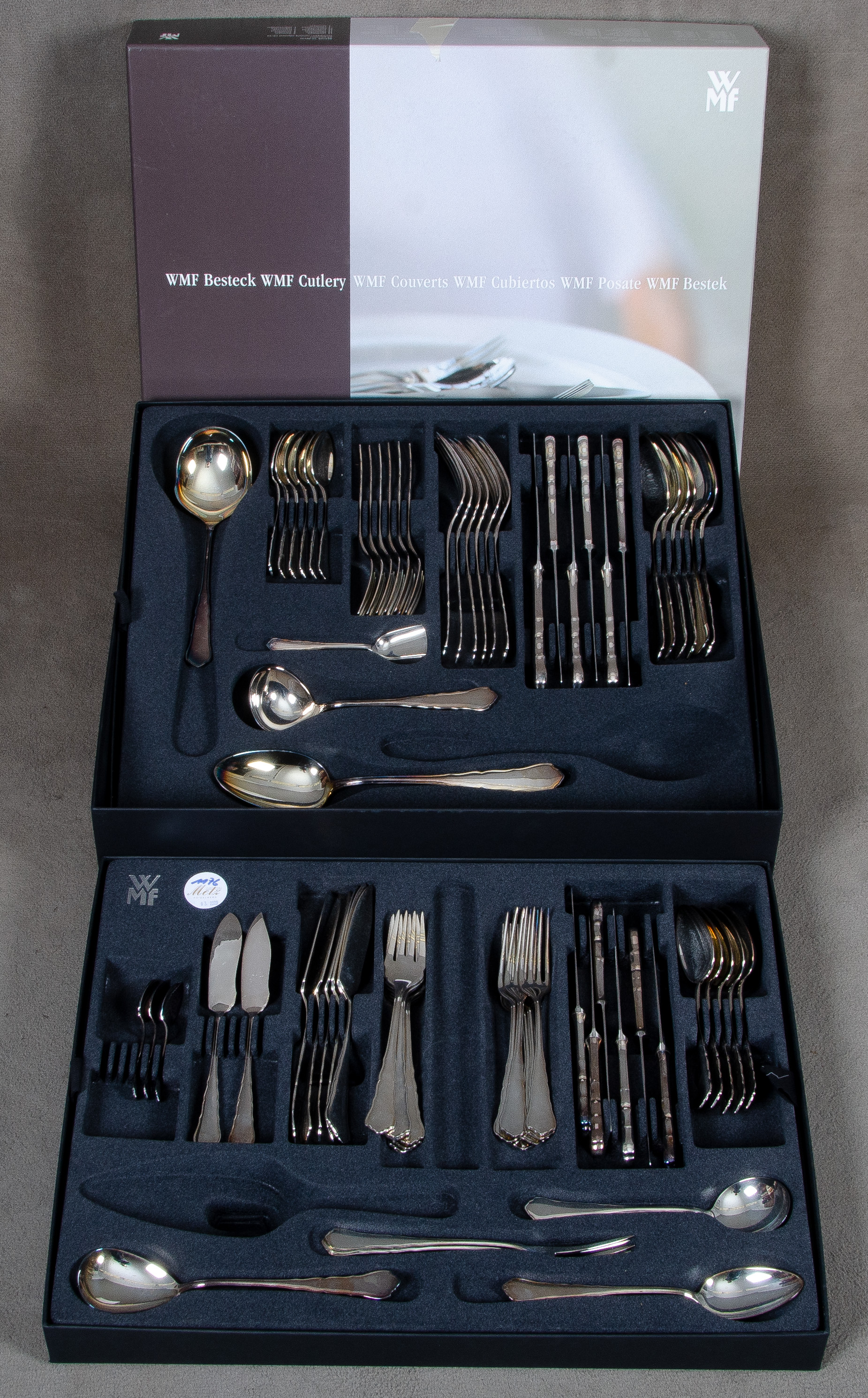 - Katalog-Nr: 1176Speisebesteck mit Chippendaledekor. WMF 20. Jh. Versilbert, in Besteckkasten.(inkomplett)o.L.
