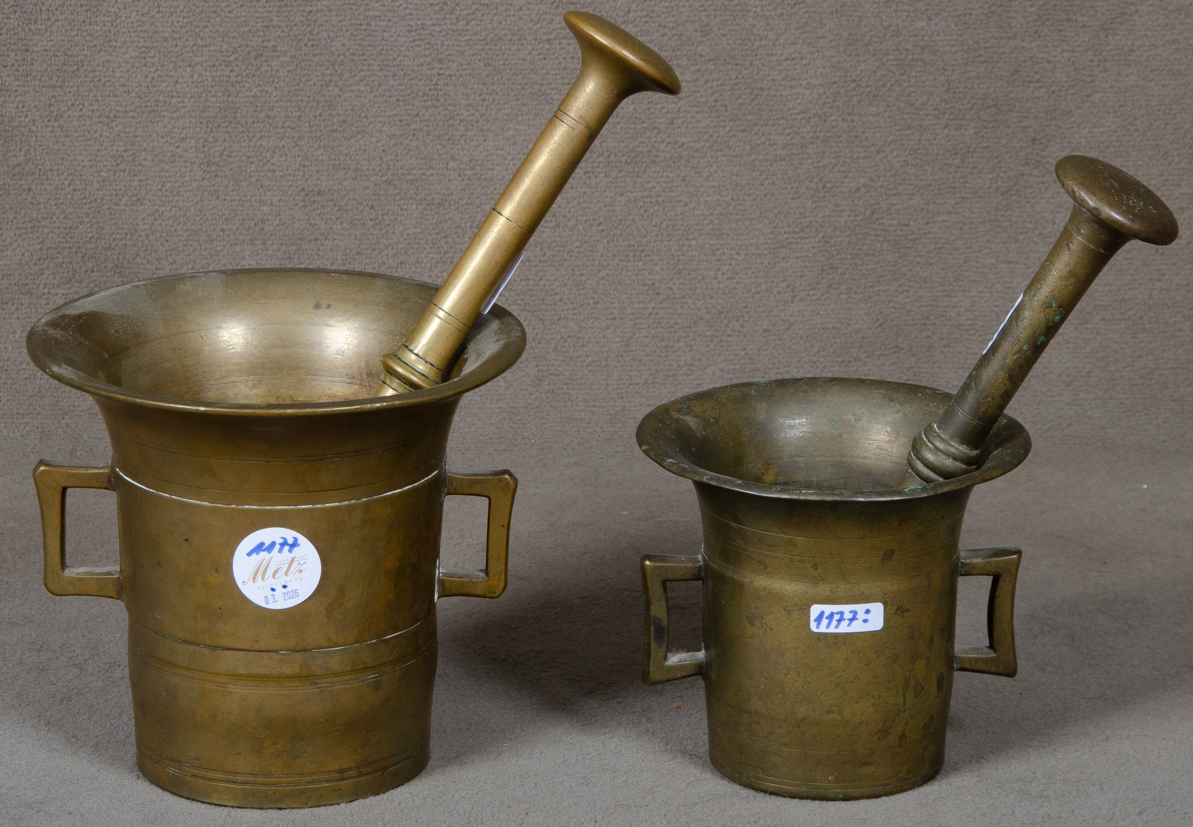 - Katalog-Nr: 1177Zwei Mörser mit Pistill. Wohl deutsch 19./20. Jh. Bronze, H=12 cm, D=13,5 cm / H=15,5 cm, D=17 cm.o.L.