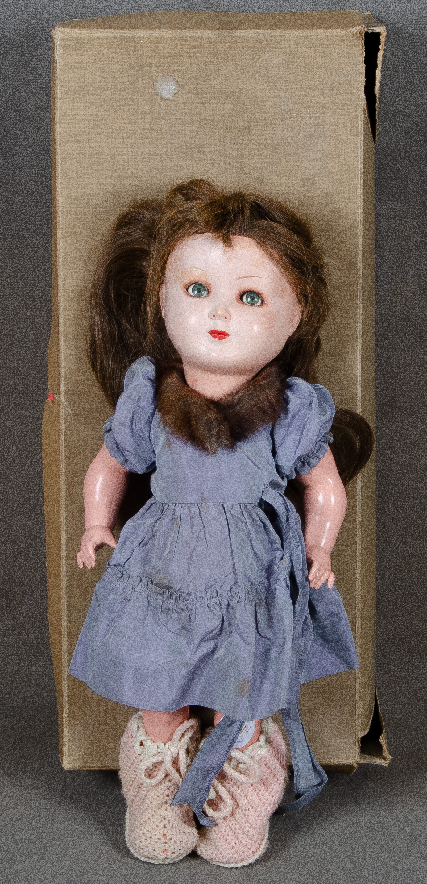 - Katalog-Nr: 1179Puppe. König & Wernicke 20. Jh. Mit Schlafaugen, geschlossenem Mund und Celluloidgliedern; verso am Nacken gemarkt und num. 322/49, in Karton, H=47 cm.o.L.