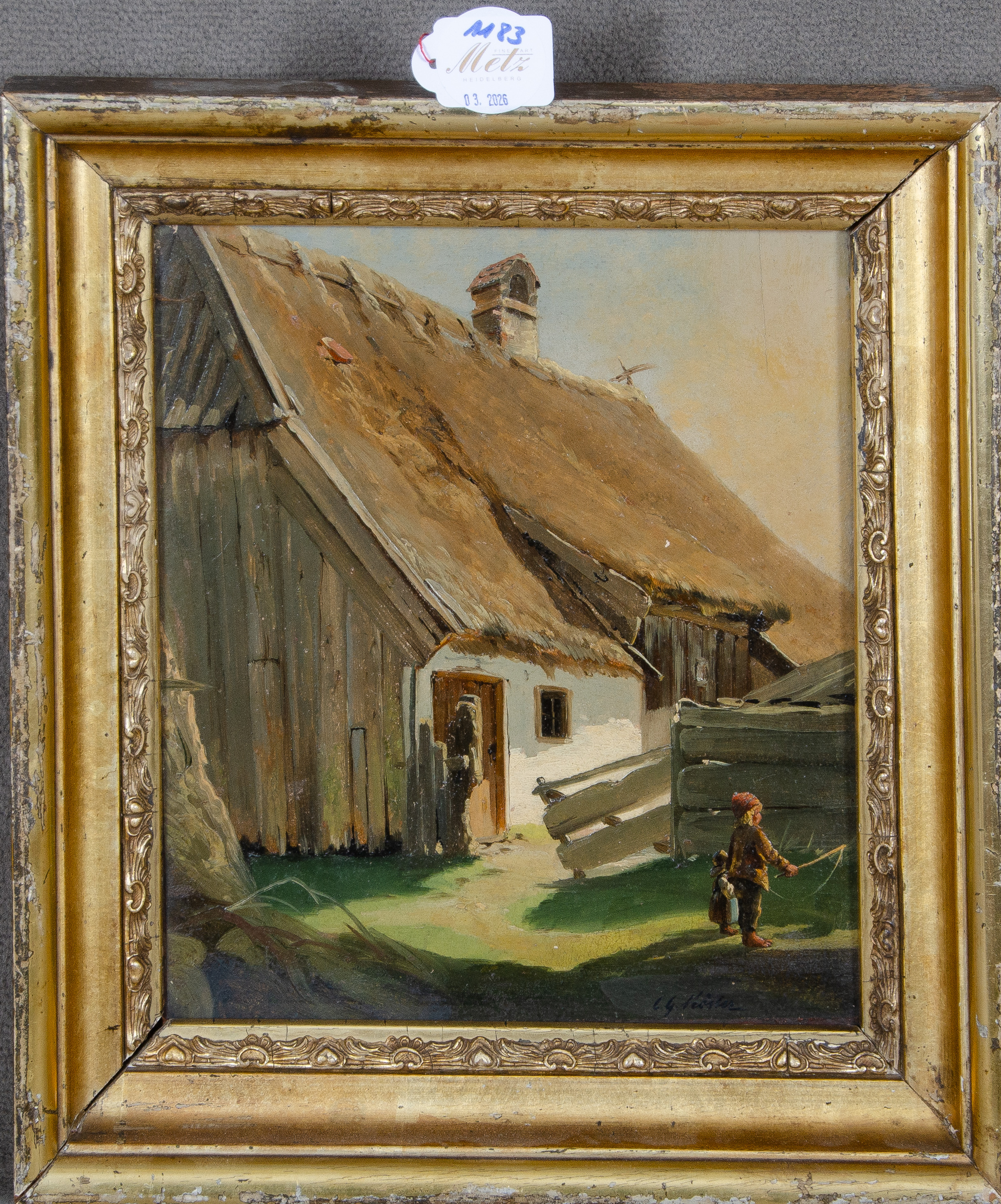 - Katalog-Nr: 1183Carl Georg Köster (1812-1893). Bauernhof mit Kindern. Öl/Holz, re./u./sign., gerahmt, 22 x 26 cm.o.L.
