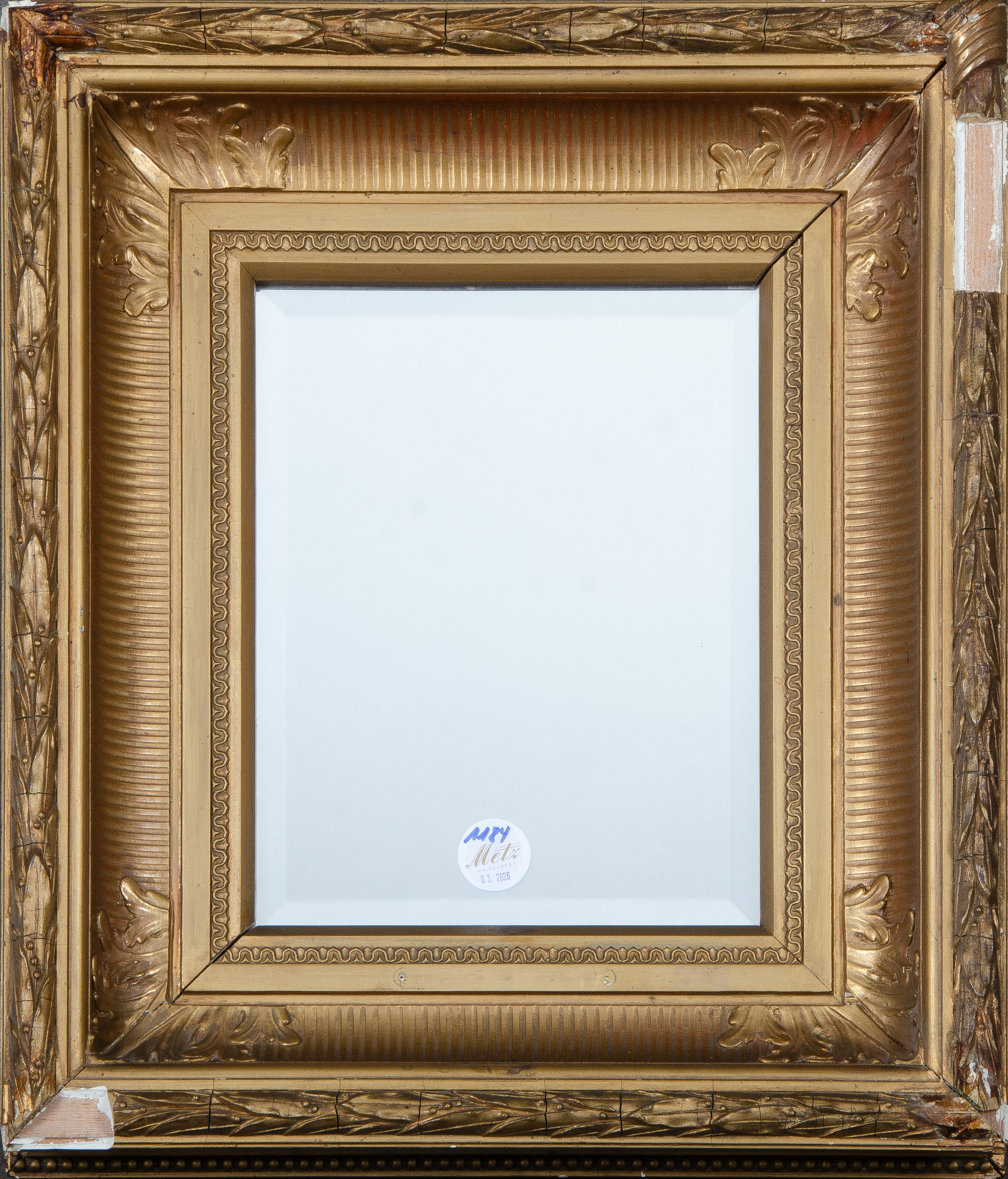 - Katalog-Nr: 1184Kleiner Wandspiegel. Deutsch um 1900. Massivholz / Stuck, profiliert, auf Kreidegrund gold gefasst, 47,5 x 41 cm. (besch.)o.L.