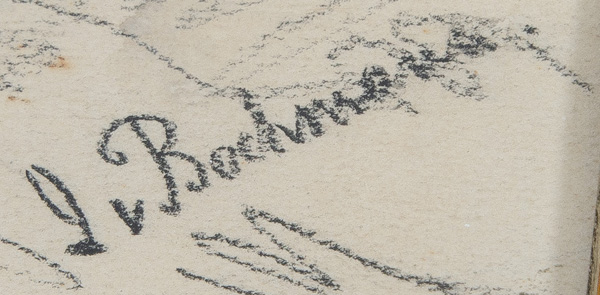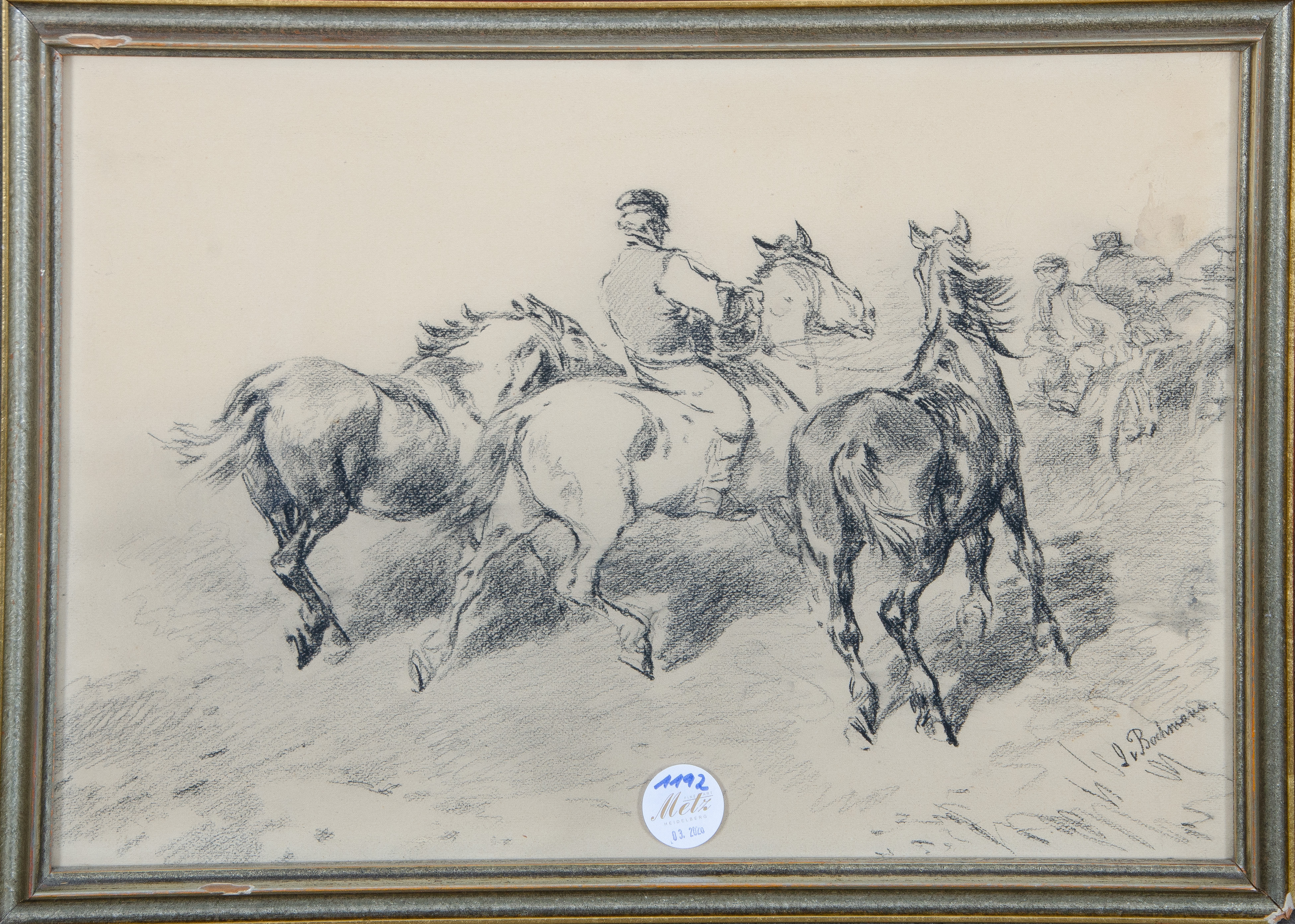 - Katalog-Nr: 1192Gregor von Bochmann (1850-1930). Bauer mit Pferden. Bleistift-/Kohlezeichnung, re./u./sign., hi./Gl. gerahmt, 29 x 42 cm. (Rahmen besch.)o.L.