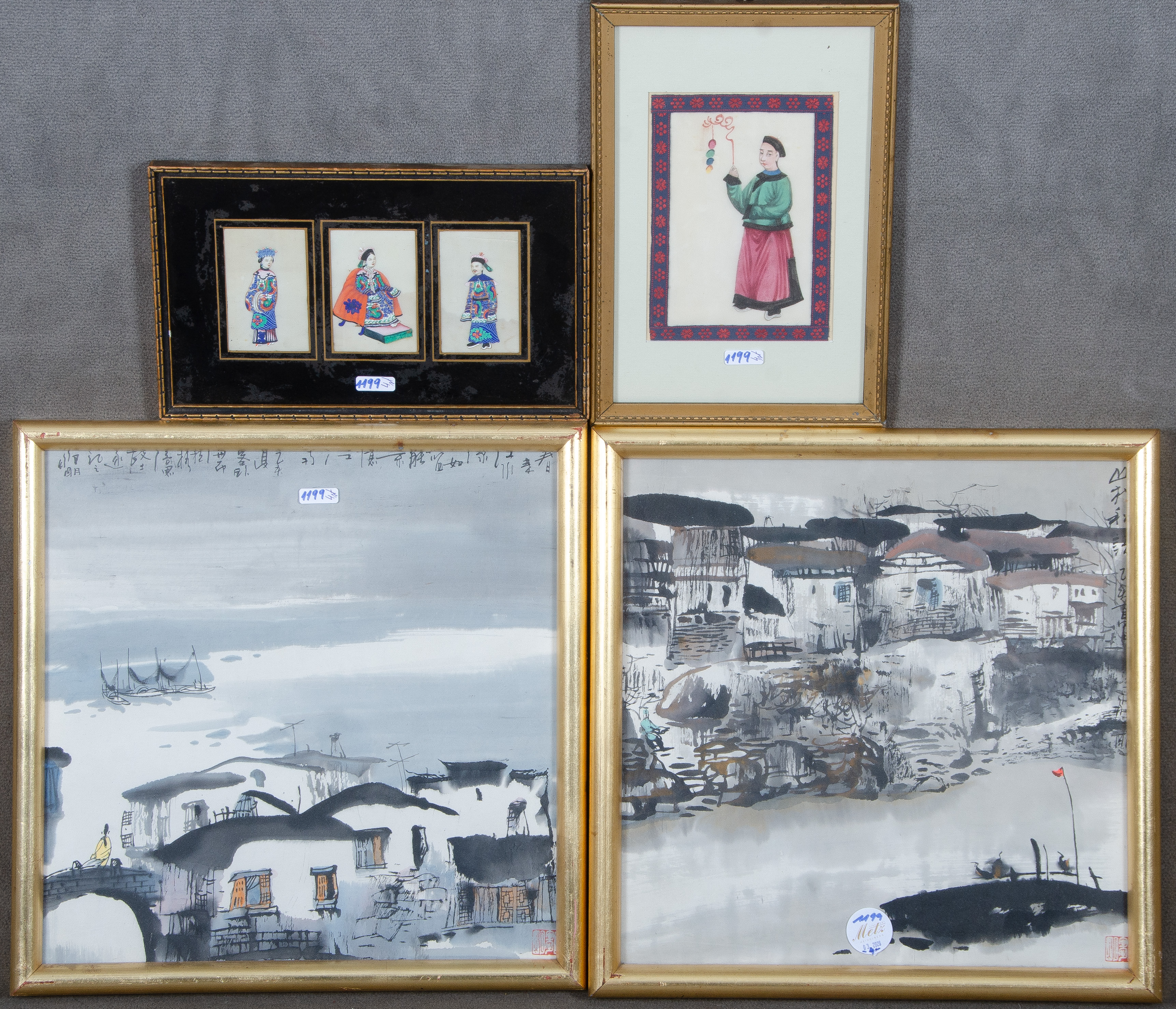 - Katalog-Nr: 1199Asiatischer Maler des 20. Jhs. Zwei Stadtansichten und zwei Darstellungen von Personen in traditionellen Gewändern. Vier Mischtechniken, teilw. mit Stempelsignatur, teilw mit Passepartout, je hi./Gl. gerahmt, 8,5 x 5 bis 34 x 33 cm.o.L.