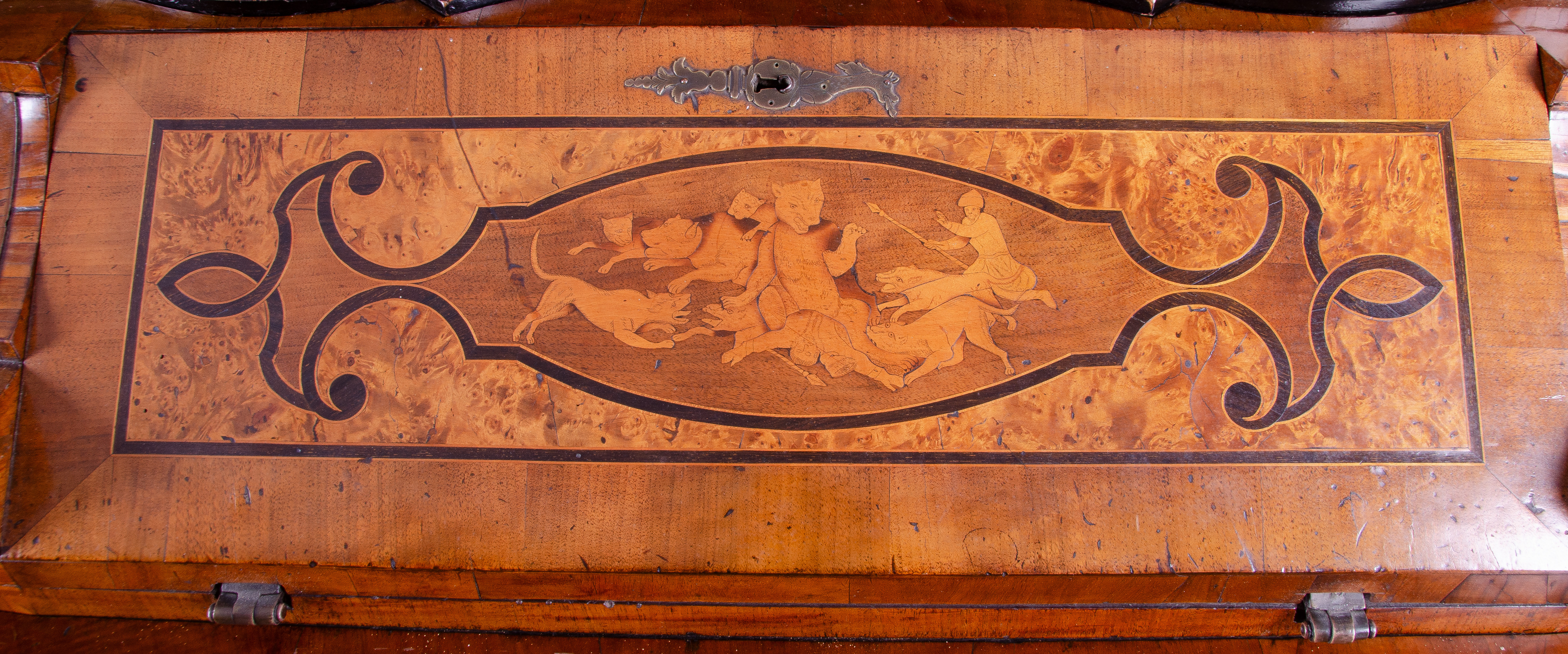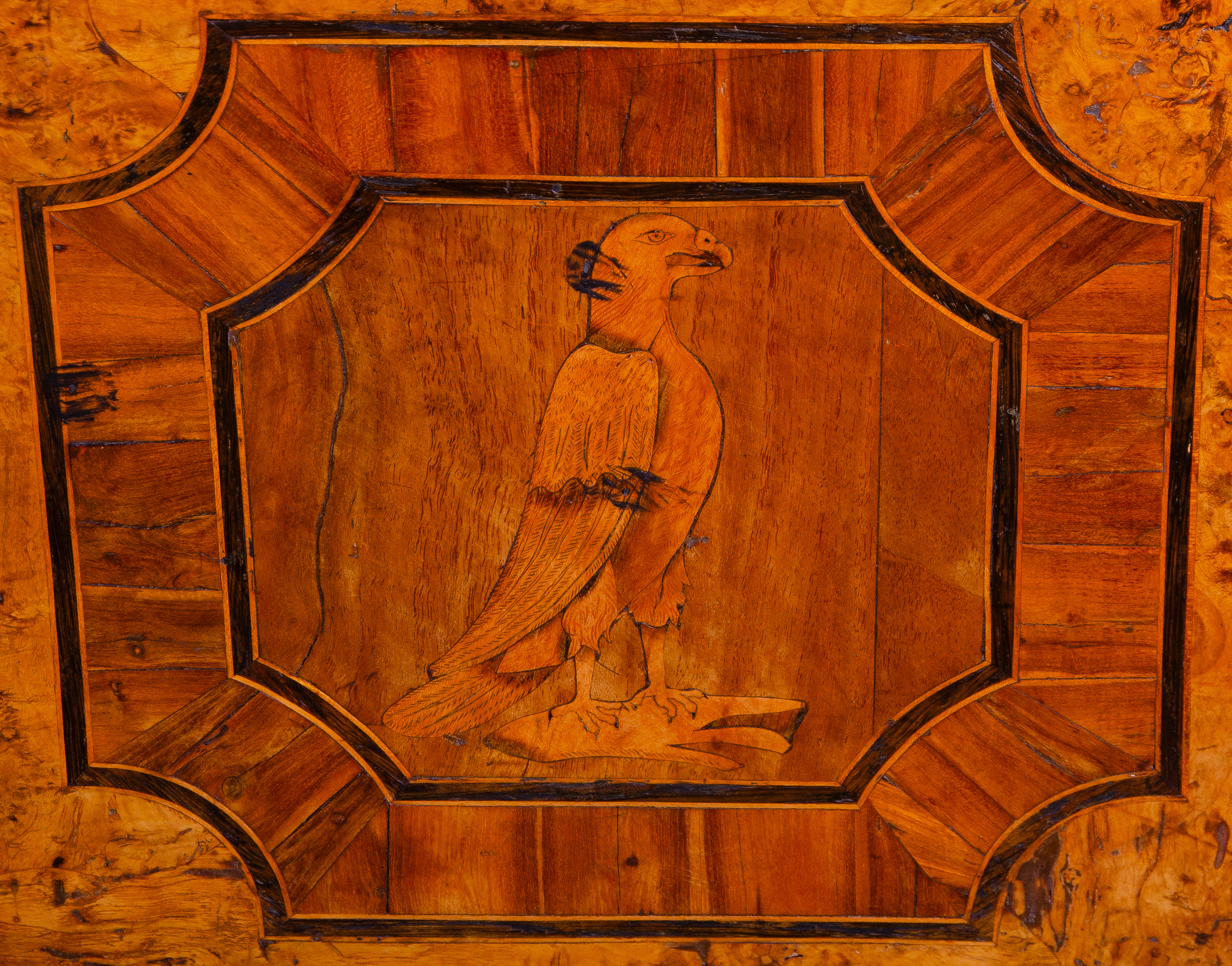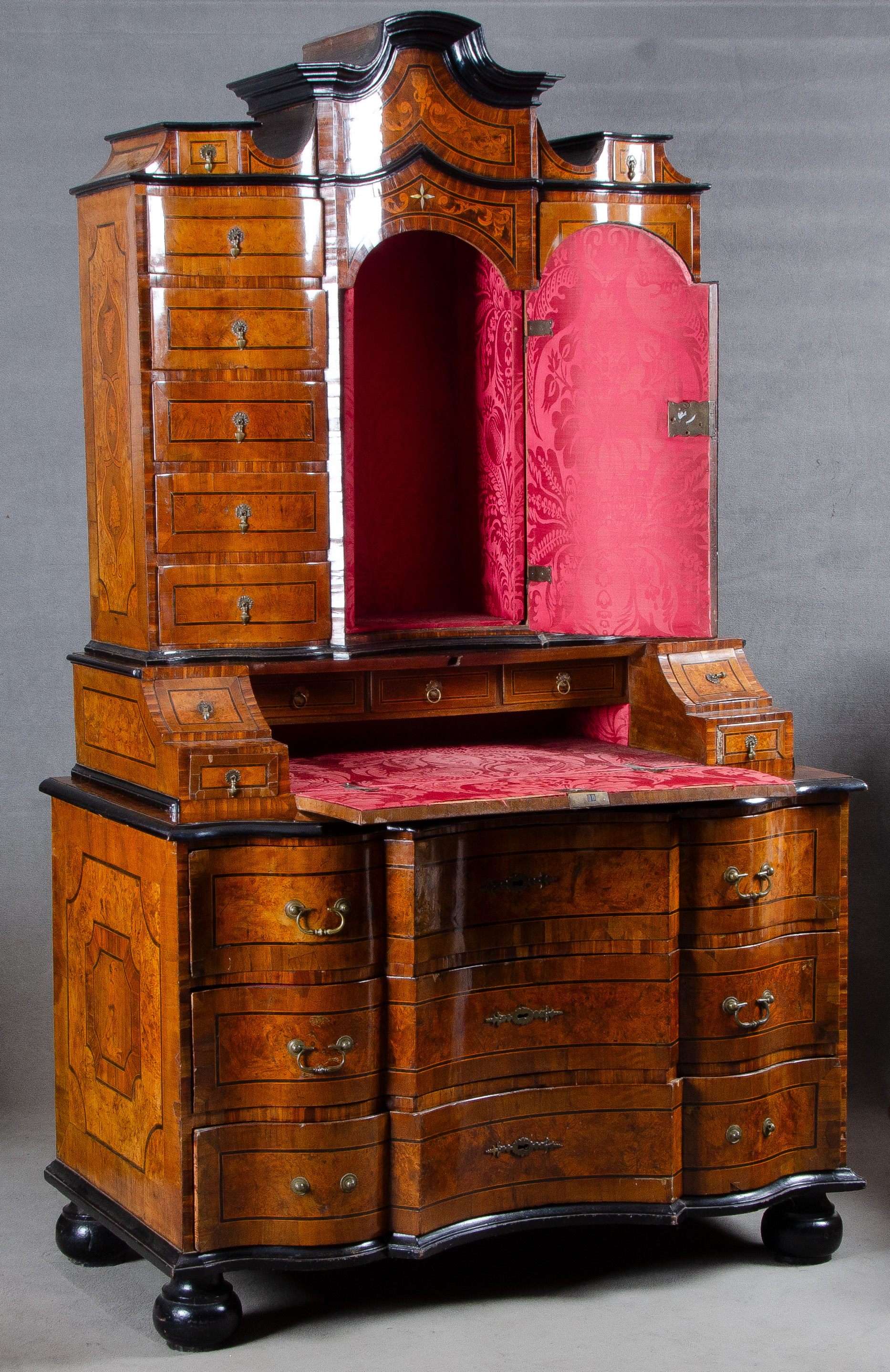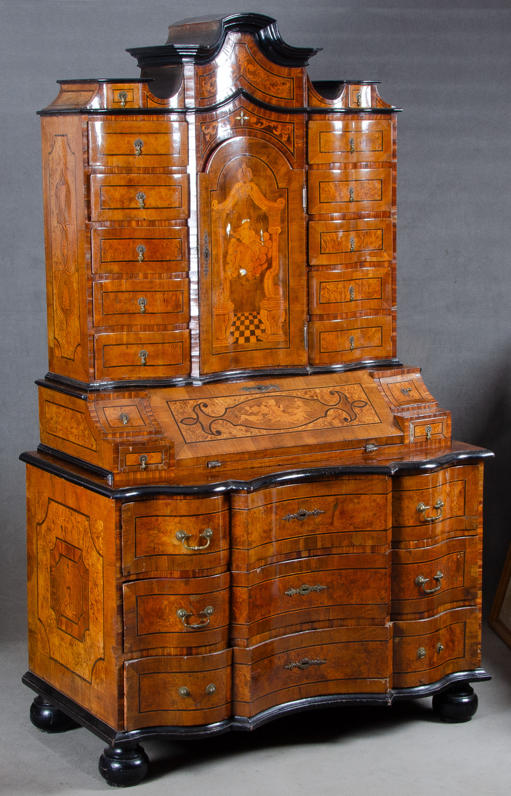 - Katalog-Nr: 1200Tabernakel. Württemberg um 1730-40. Nussbaum, Zwetschge und Vogelaugenahorn furniert, marketiert und schattiert mit Band- und Fadenmuster, Blüten, Blättern, mythologischen Figuren, Jagdszenen, Tauben und Vögel an den Seiten, Umleimer und Kugelfüße ebonisiert, Messingbeschläge; dreischübig, doppelt gebauchte Front, Schreibklappe mit Inneneinteilung, flankiert von je zwei Schüben, Aufsatz der Form des Unterbaus folgend, Tabernakeltür flankiert von je fünf Schüben, geschweifter, profilierter Giebel. (alte Patina), H=210 cm, B=125 cm, T=67 cm.o.L.