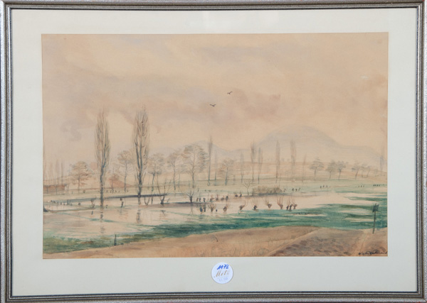 - Katalog-Nr: 1178Eugen Croissant (1898-1976). Überflutete Landschaft mit Bäumen. Aquarell/Papier, re./u./sign., mit Passepartout hi./Gl. gerahmt, 32 x 48 cm.o.L.
