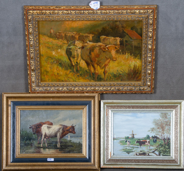 - Katalog-Nr: 1198Arthur Schmieder (Maler des 19./20. Jhs.) u.a. Kühe auf der Weide bzw. am Ufer. Öl/Lw., li./u./sign./dat. 1958, hi./Gl.; Aquarell/Papier, li./u./monogr., hi./Gl.; Öl/Holz, li./u./sign. Je gerahmt, 17 x 22,5 bis 21 x 36,5 cm.o.L.