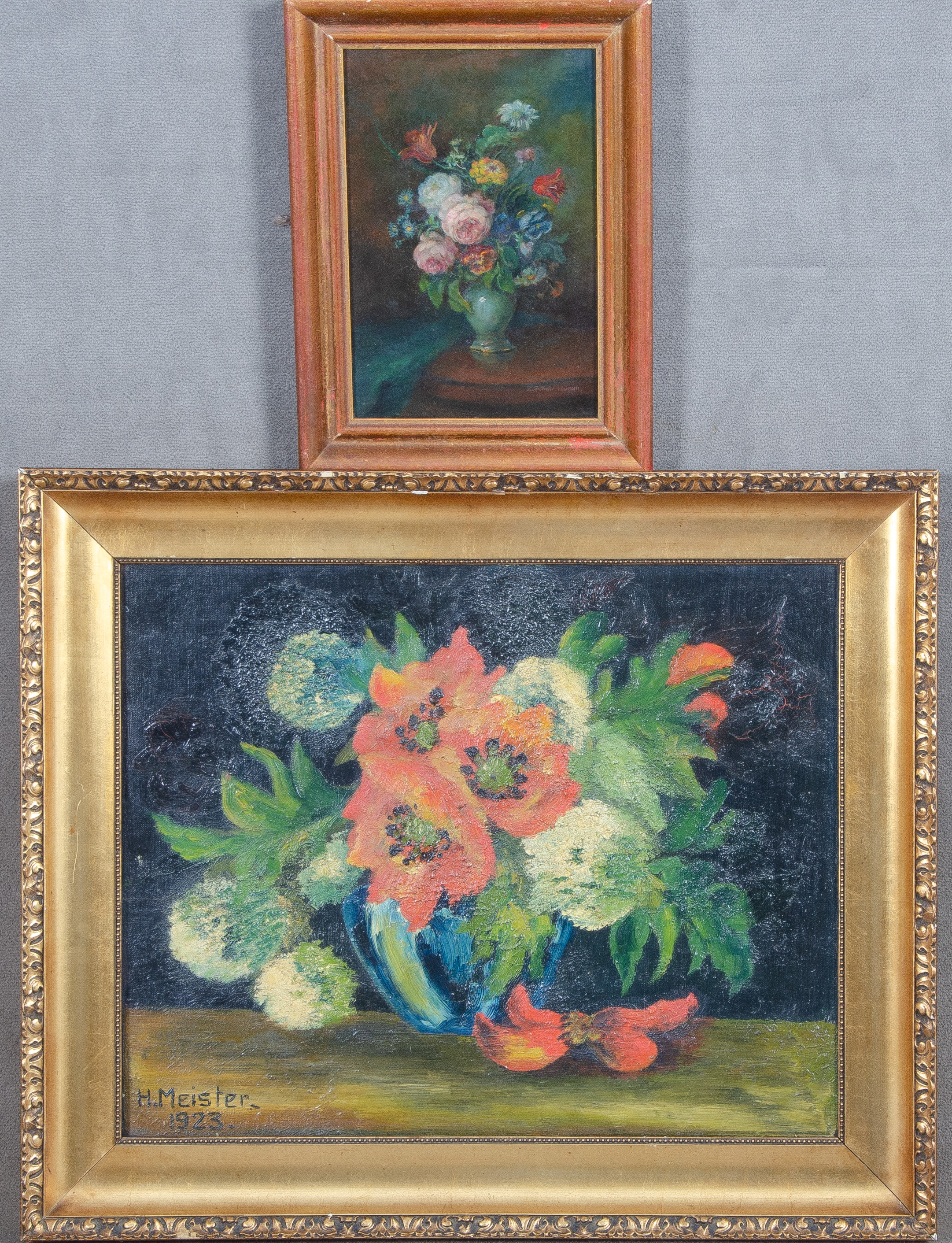 - Katalog-Nr: 1226Ella Hippler-Schulz (1872-1966) / H. Meister (Maler des 20. Jhs.). Zwei Blumenstillleben. Öl/Malkarton, re./u./sign. bzw. Öl/Lw., li./u./sign./dat. 1923, je gerahmt, 26 x 19 / 40 x 50 cm.o.L.