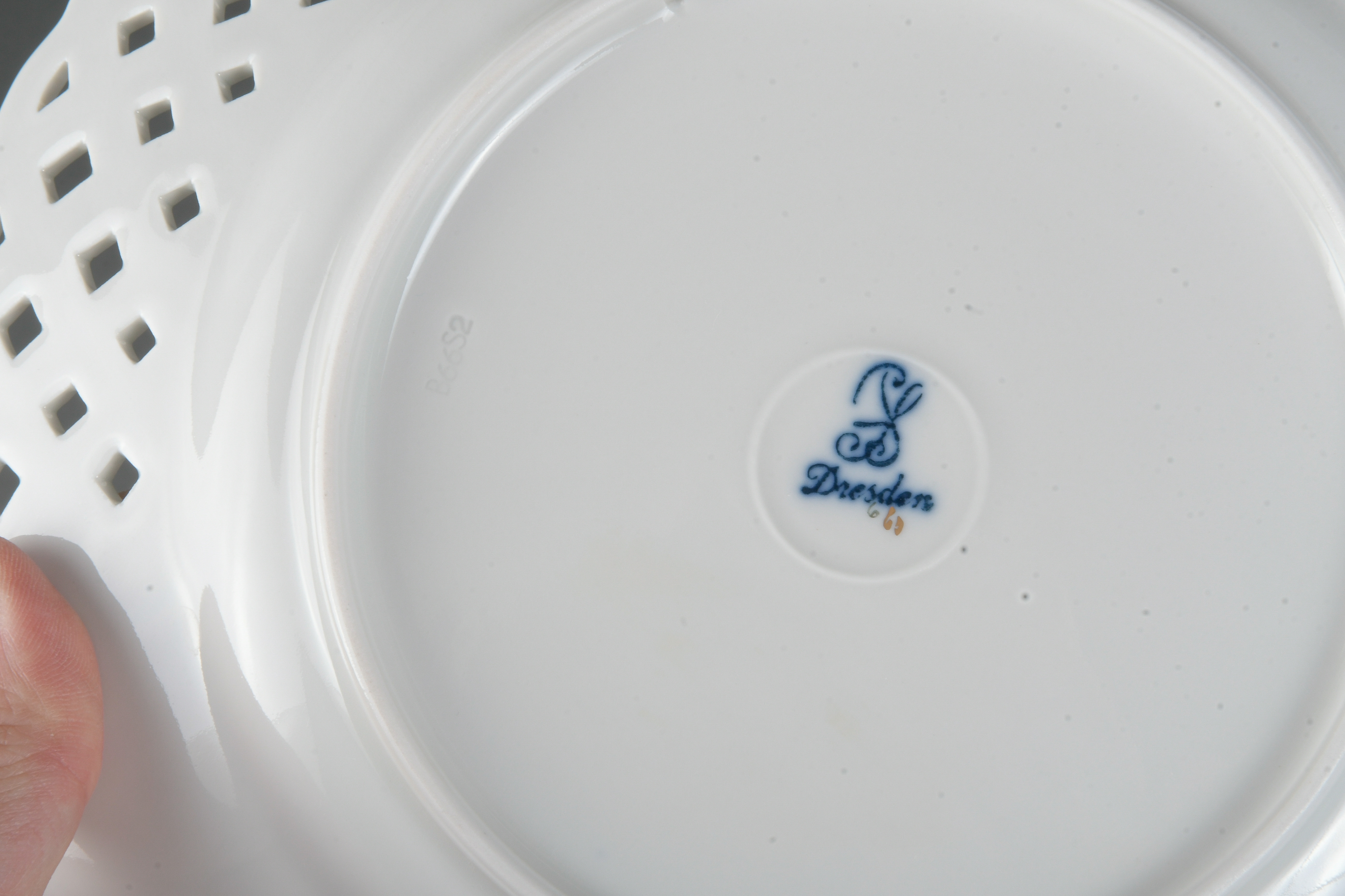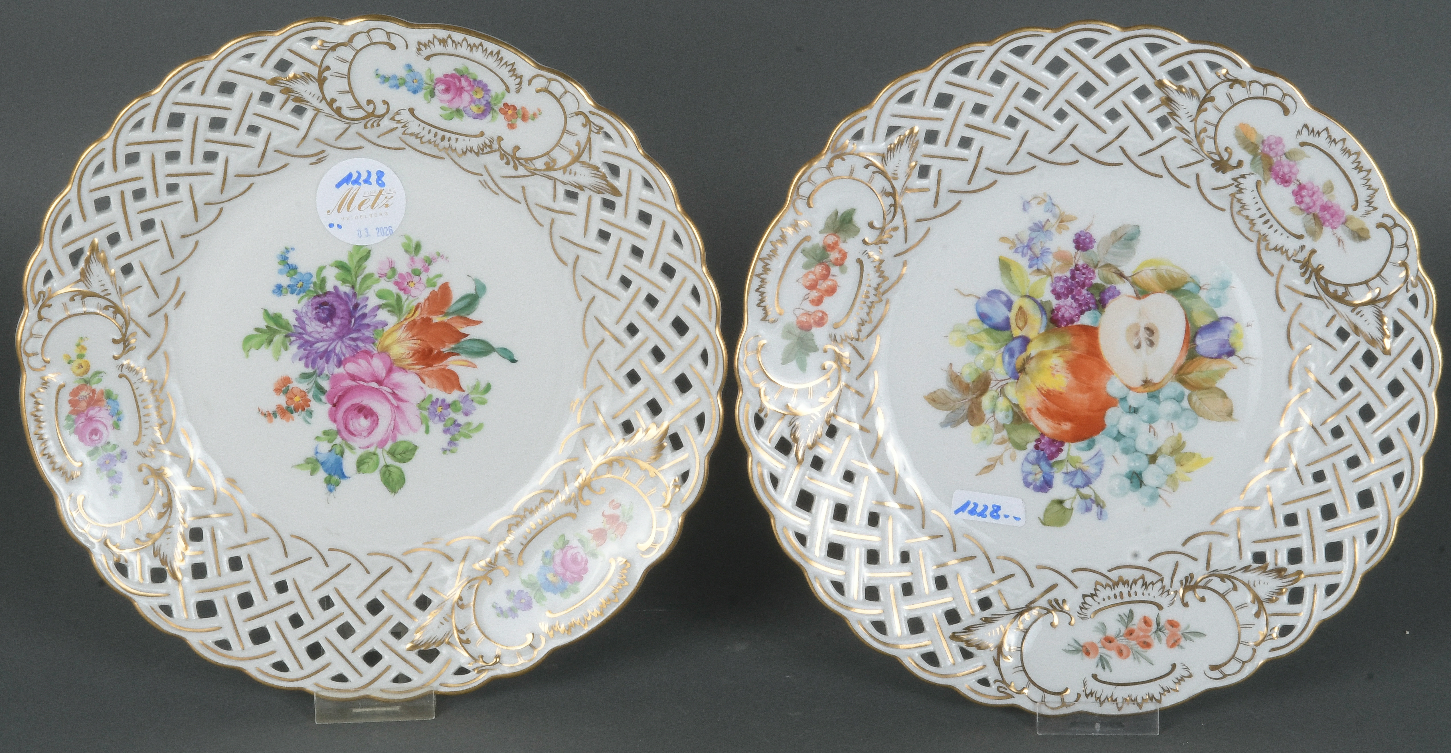 - Katalog-Nr: 1228Zwei Durchbruchsteller. Dresden 20. Jh. Porzellan, bunt bemalt mit Blumen- bzw. Obstbouquet, gold gesäumt; verso unterglasurblaue Stempelmarke, D=je 23,6 cm.o.L.